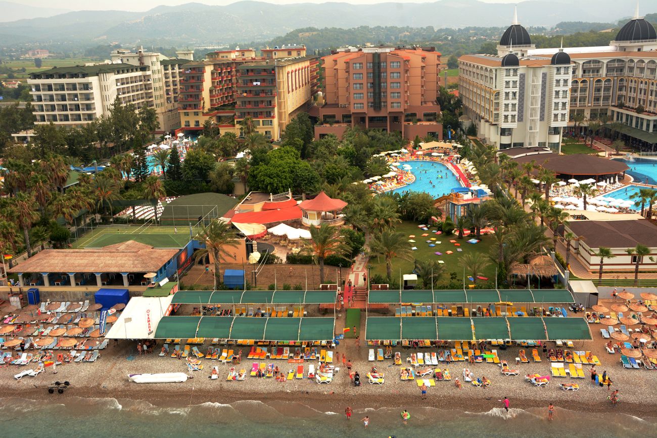 на 90 км от летище Анталия, на брега на морето, собствен пясъчен плаж, на 35 км от центъра на града