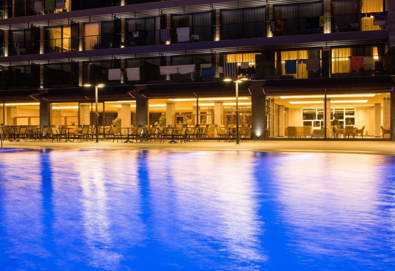 Основен ресторант, 4 бара, 4 басейна (основен, аква басейн с 5 водни пързалки, релакс басейн, плувен басейн), 3 детски басейна, фитнес център, амфитеатър, паркинг.
