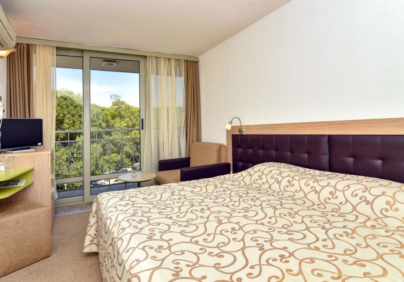 Стаи с парков изглед:(около 12 кв. м) - уютно и комфортно обзаведени. Всяка от тях разполага с две събрани единични стандартни легла и разтегателен фотьойл, което я прави подходяща за настаняване на максимум 3 възрастни или 2 възрастни и 1 дете. Баните са с душкабина.