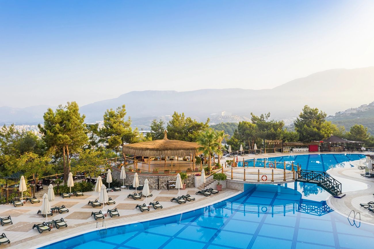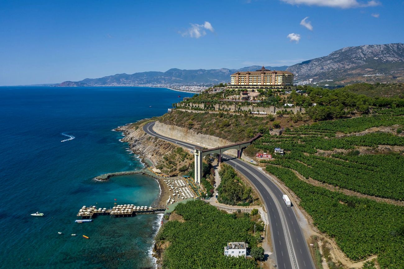 Utopia World Hotel е разположен на 155 километра от летището на Анталия, на 20 километра от Алания, на 5 километра от селището Махмутлар, на 150 метра от собствения си плаж.