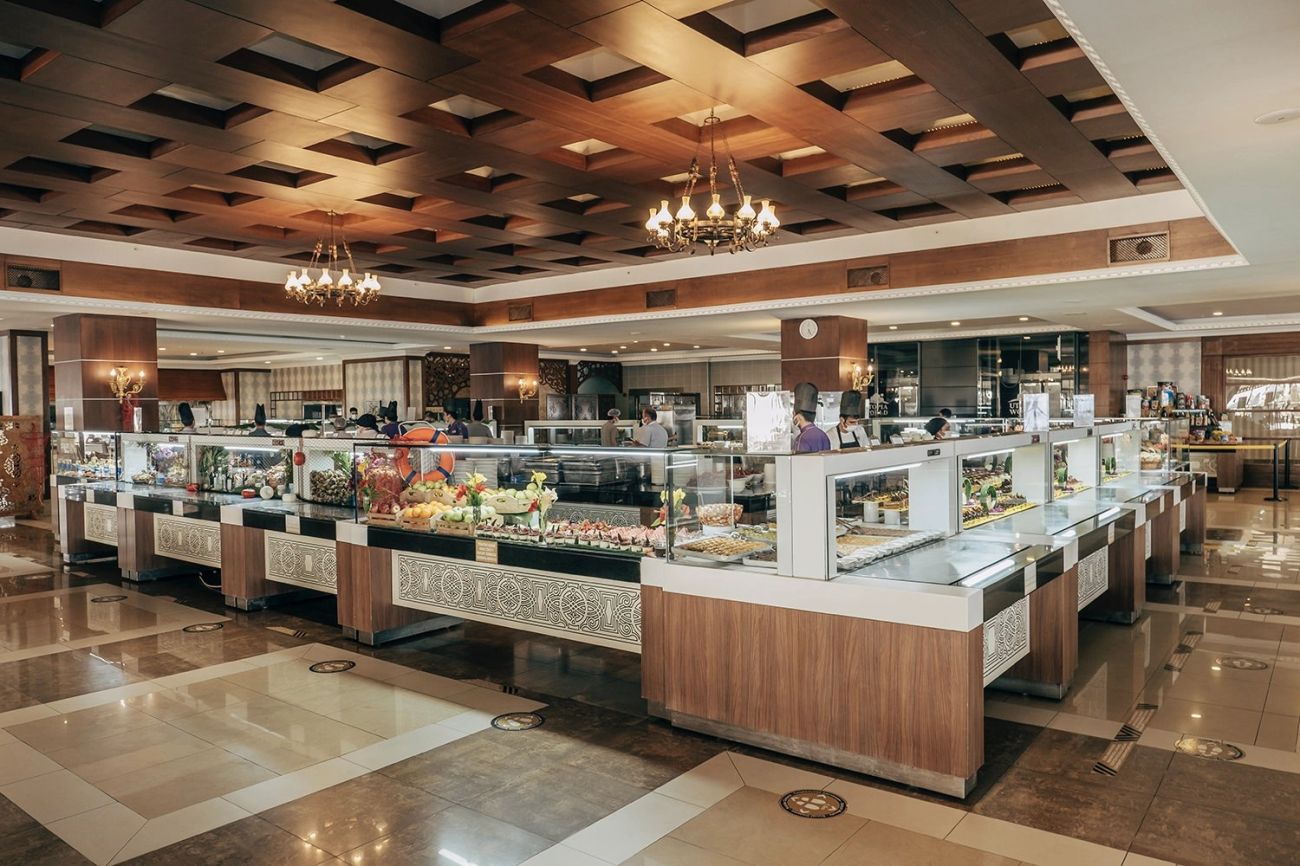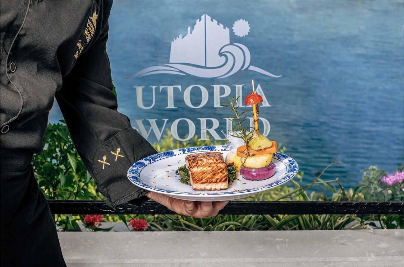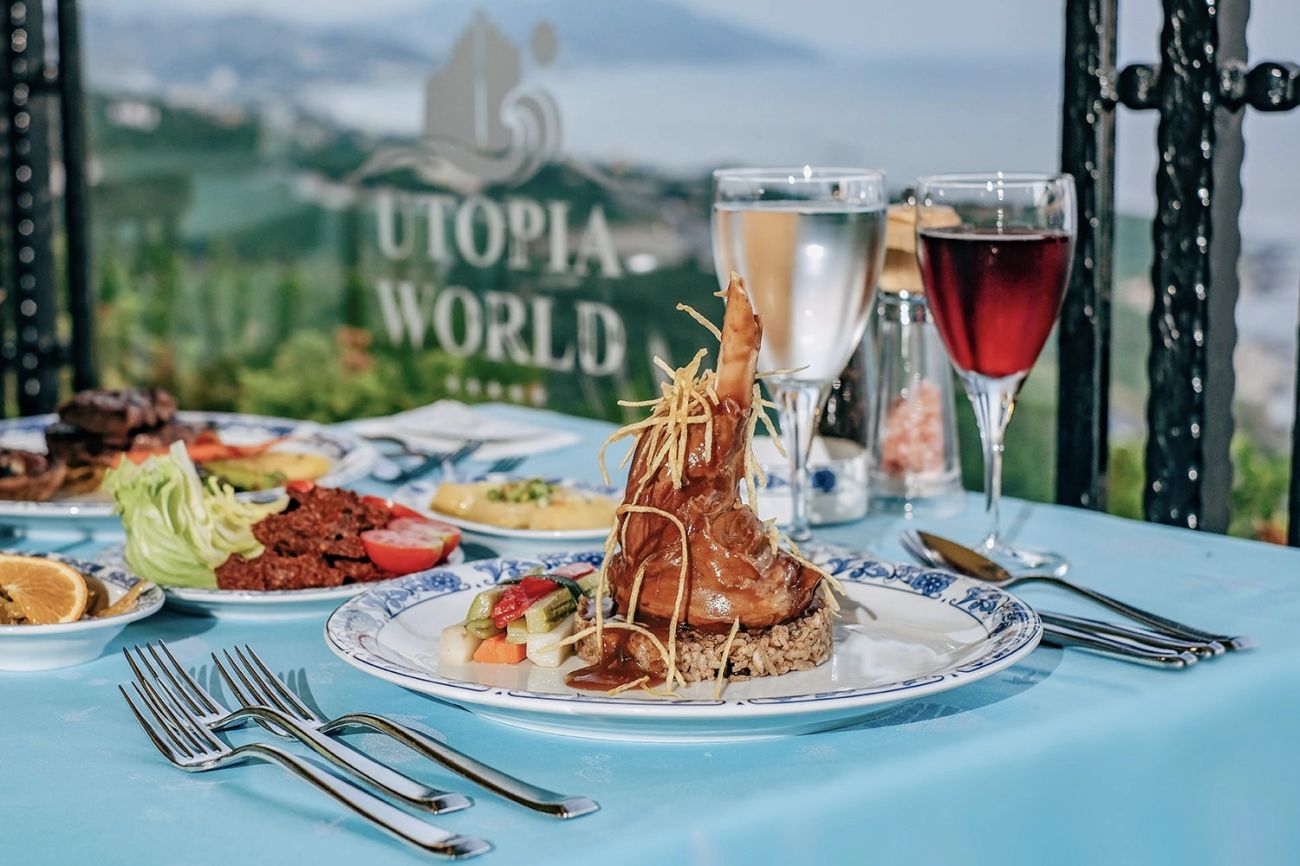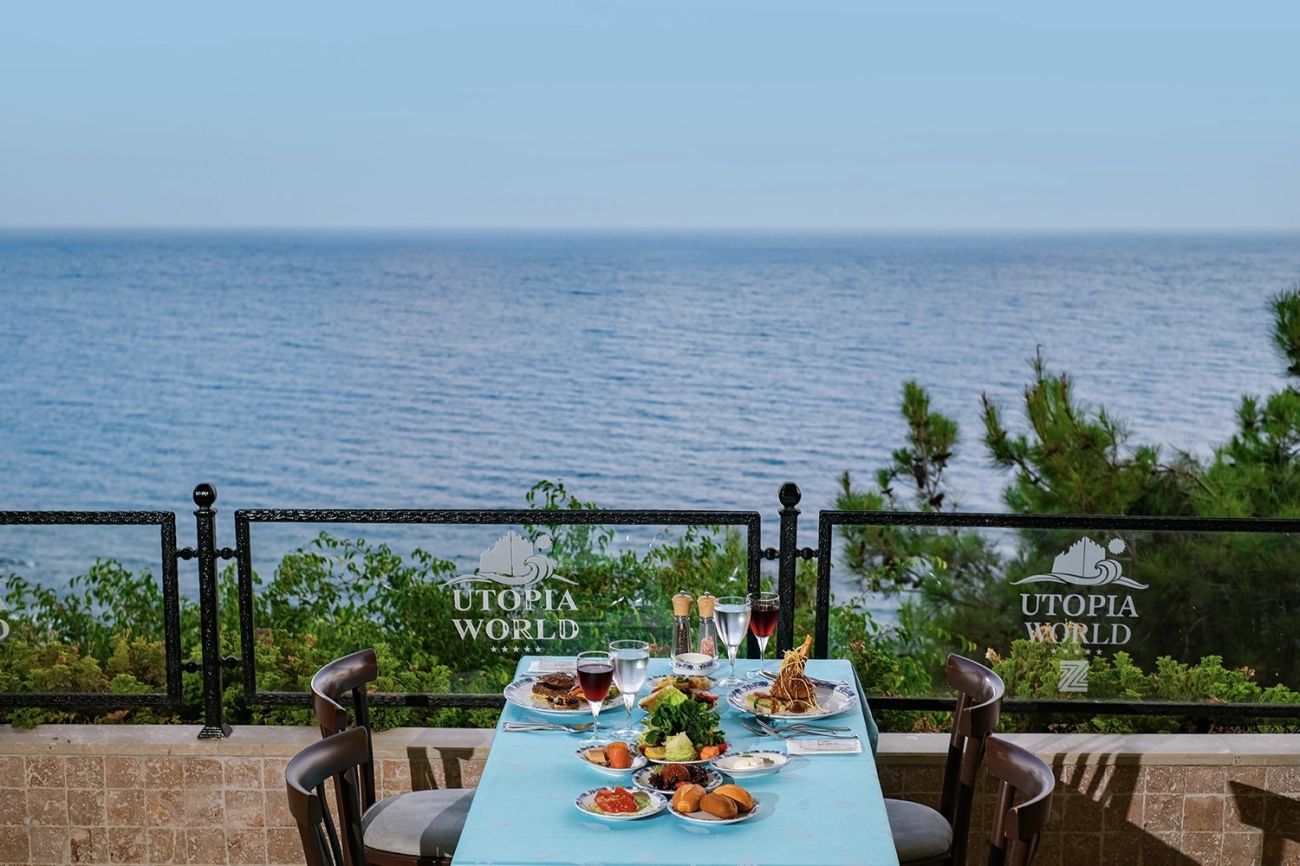 Хотел Utopia World предлага основен ресторант, диетично меню, вегетарианско меню, 3 ресторанта а la carte (турски, италиански и рибен – резервацията се заплаща), 6 бара, 7 открити басейна, закрит басейн, 8 водни пързалки, лекарски кабинет, SPA център, фризьорски салон, магазини, пералня, химическо чистене, 3 конферентни зали (за 88–750 чов.).