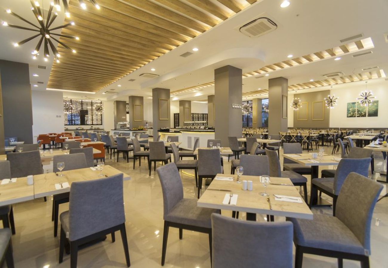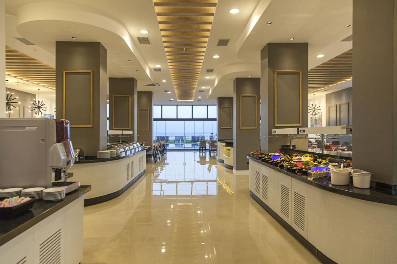В All Inclusive концепцията на хотела са включени закуска (07.00ч.-09.30ч.), обяд (12.30ч.-14.00ч.), вечеря (19.30ч.-21.00ч.), 2 пъти седмично тематични вечери - турска и средиземноморска, местни безалкохолни и алкохолни напитки от 11.00ч. до 23.00ч. в лоби бара и снек бара на хотела, снаксове от 11.00ч. до 18.00ч. - салати, картофки, сандвичи и др.