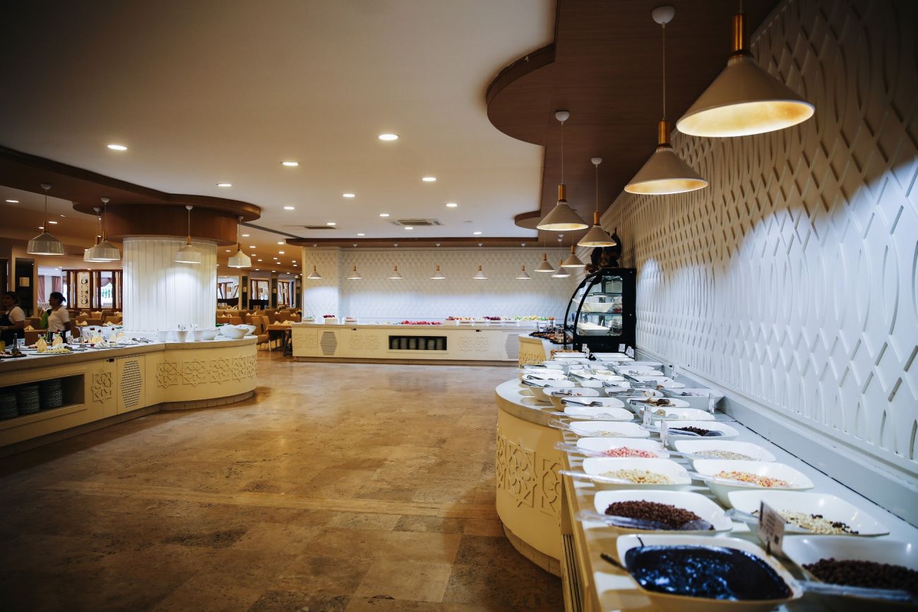 Хотелът функционира на база ULTRA All Inclusive, включваща закуска, обяд и вечеря на блок маса, допълнителни закуски и неограничена консумация на местни алкохолни и безалкохолни напитки, както и някои вносни напитки. На разположение на гостите са основен ресторант (има диетично, безглутеново и вегетарианско меню), 3 ресторанта a-la-carte (рибен, италиански, турски - с предварителна резервация, едно посещение за целия престой - безплатно), 9 бара.