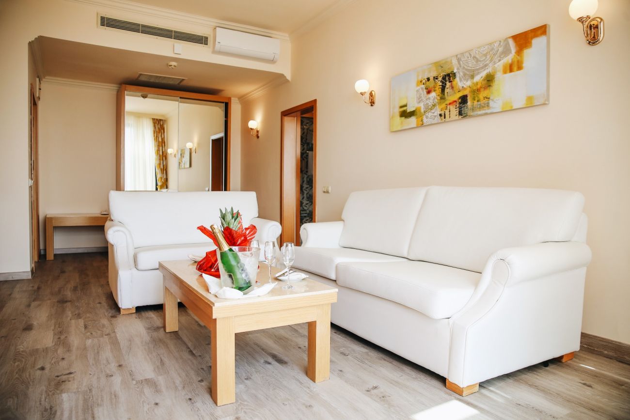 Кралски апартамент с изглед градина/море (~98 кв. м) - спалня и хол, отделени с врата, разполага със спалня и 2 дивана, балкон. VIP услуга за гостите: халати и чехли, при настаняване плодове и шампанско в стаята, ползване на VIP плаж с беседки и бар на плажа.