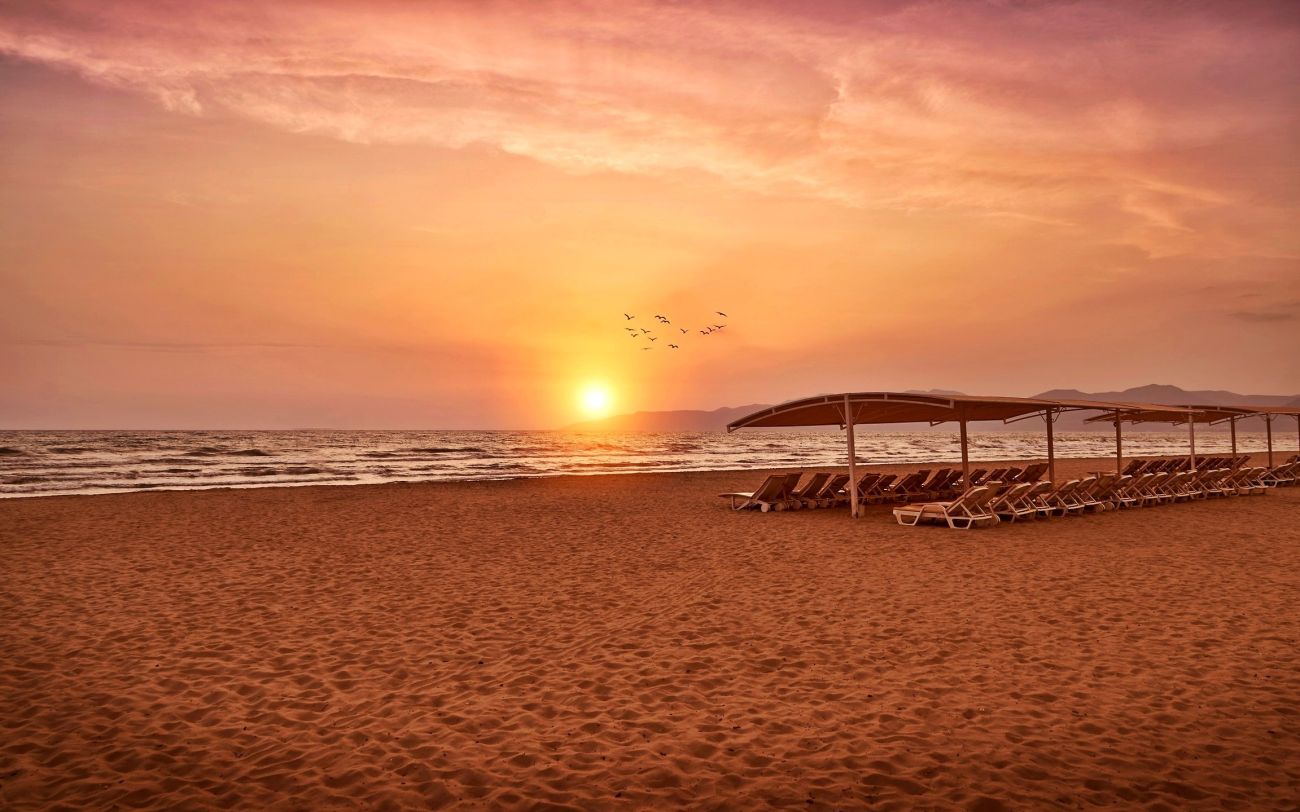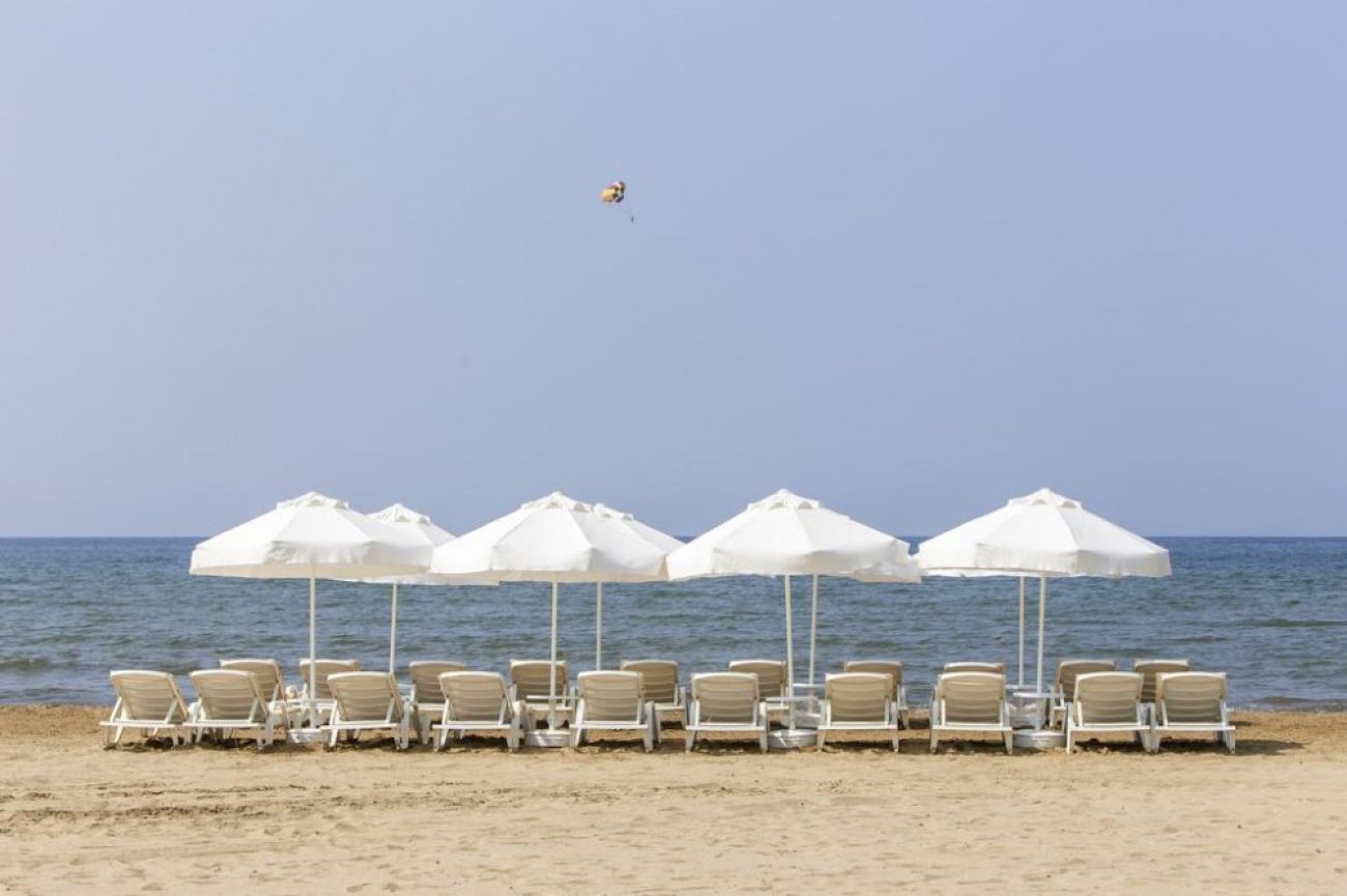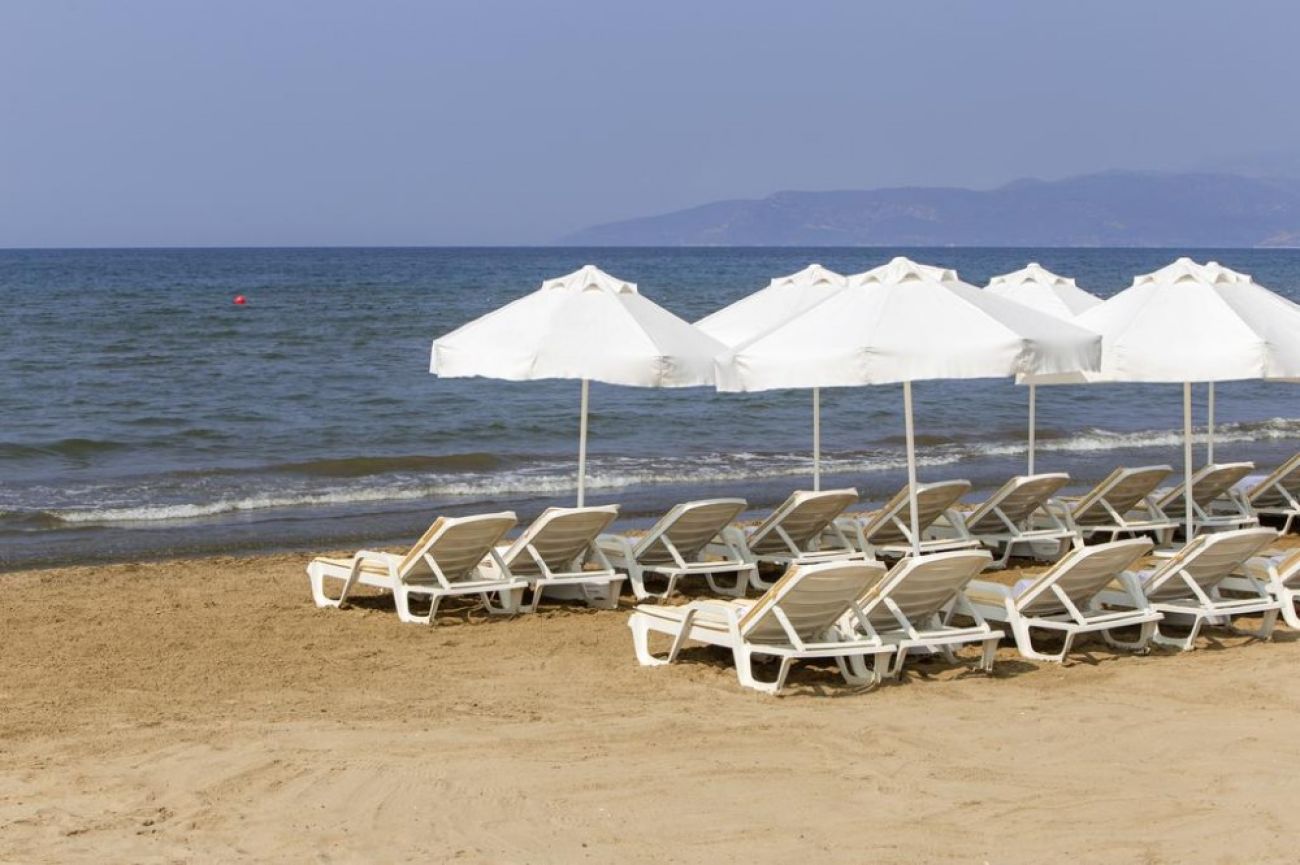 Собствен, пясъчен. Чадъри и шезлонги на плажа и при басейна - безплатно.