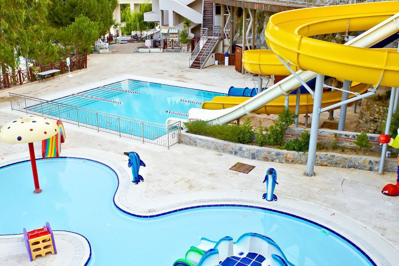 2 открити басейна, водни пързалки, детска площадка, мини клуб (4-12 г.).