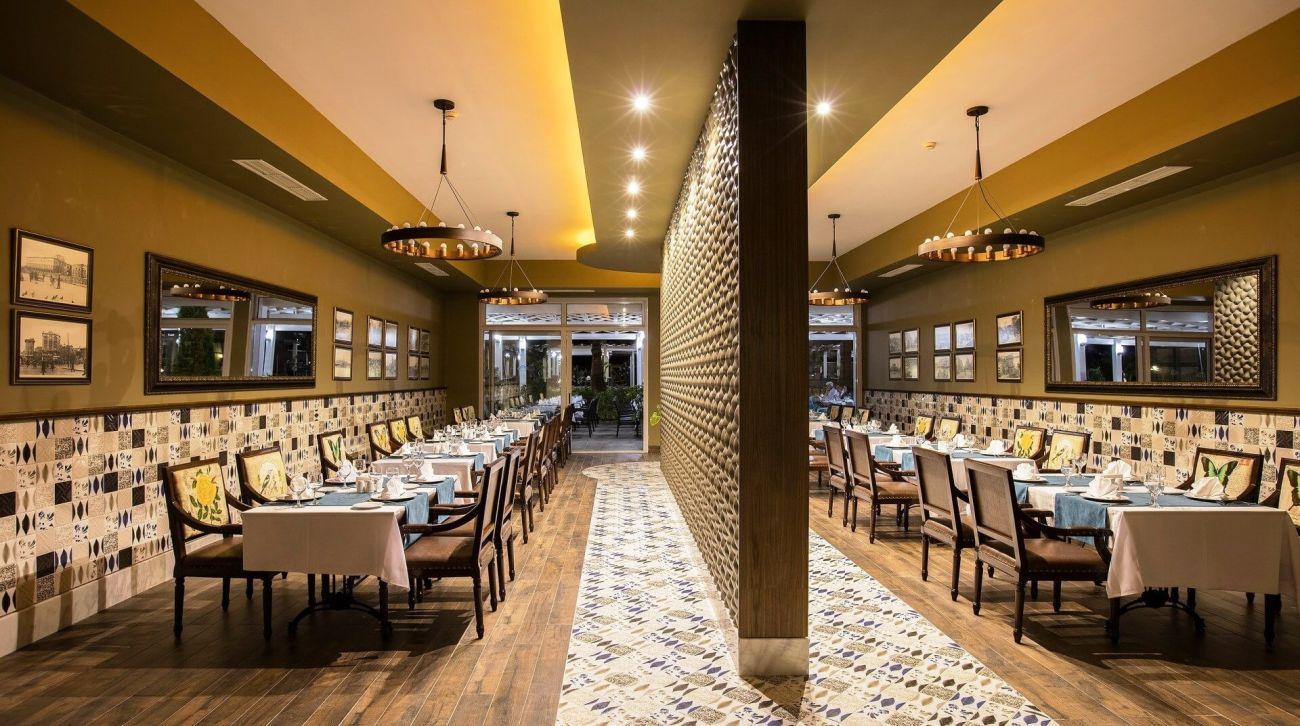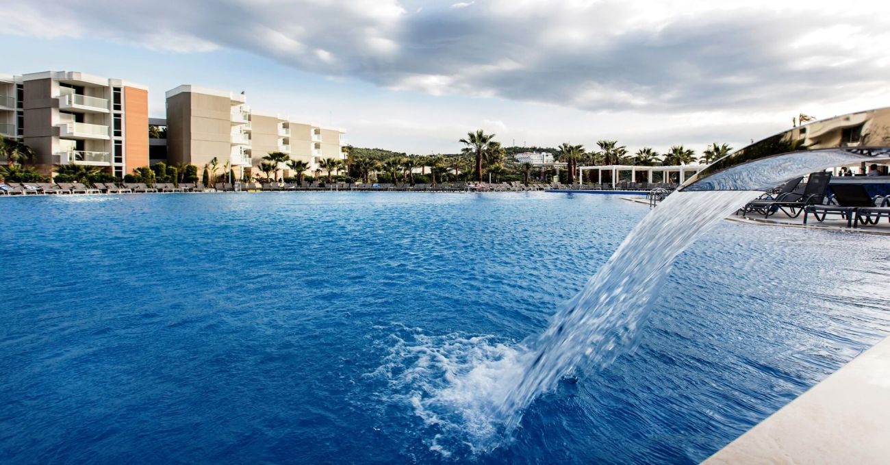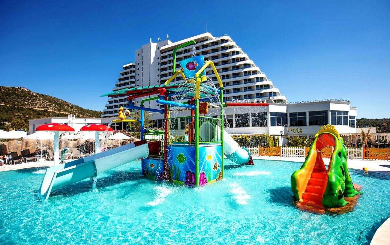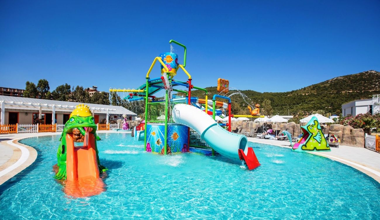 Разполага с основен ресторант, 3 а-ла-карт ресторанта (рибен, италиански, турски - с предварителна резервация; безплатно посещение на един от ресторантите при едноседмичен престой), снек ресторант, гьозлеме, сладкарница, лоби бар, бар басейн, релакс бар, снек бар, диско бар, общо 10 открити басейна със 7 водни пързалки, 1 основен открит басейн - 1200 м2, релакс басейн - 500 м2, закрит басейн - 140 м2 и детски басейн с водни пързалки - 200 м2.