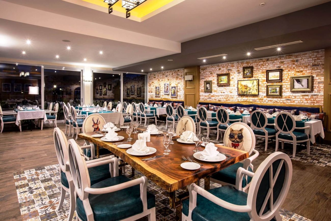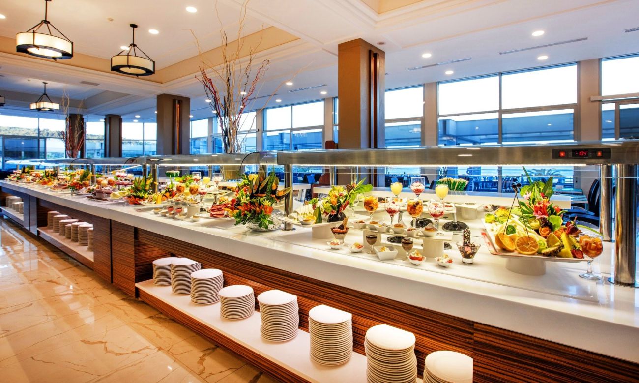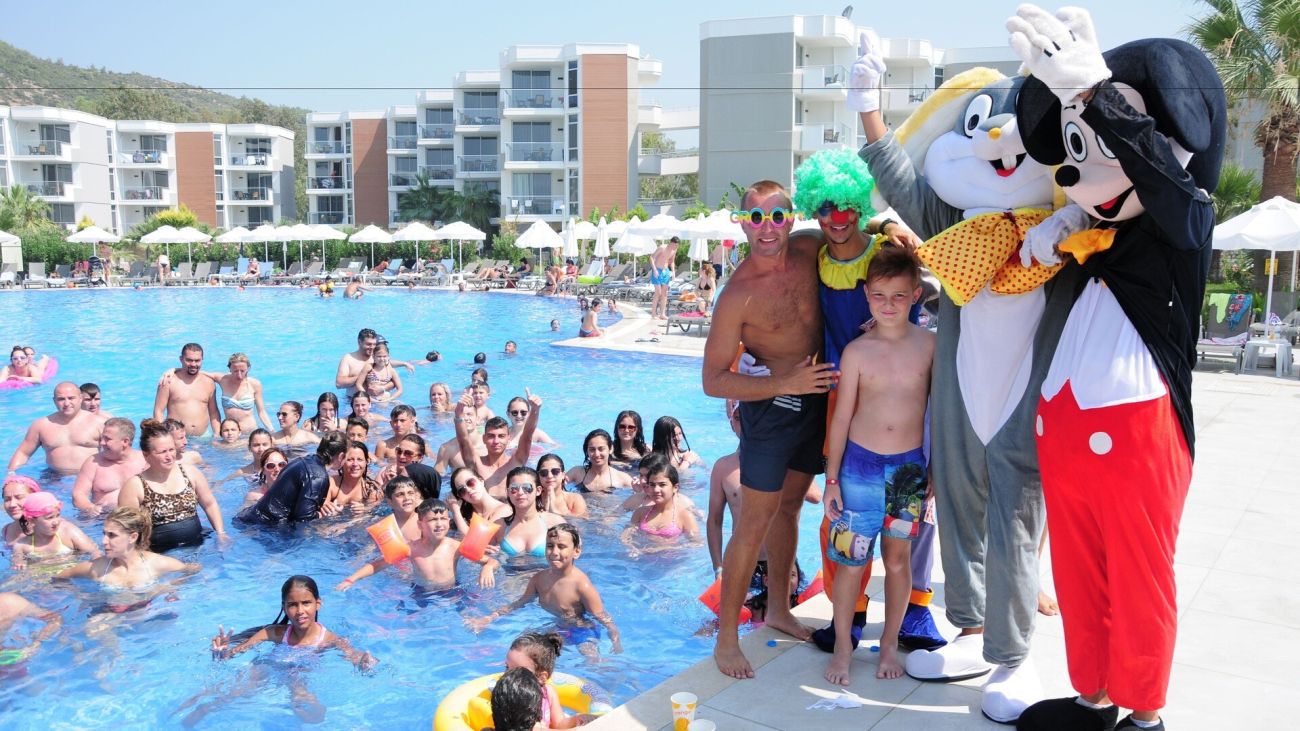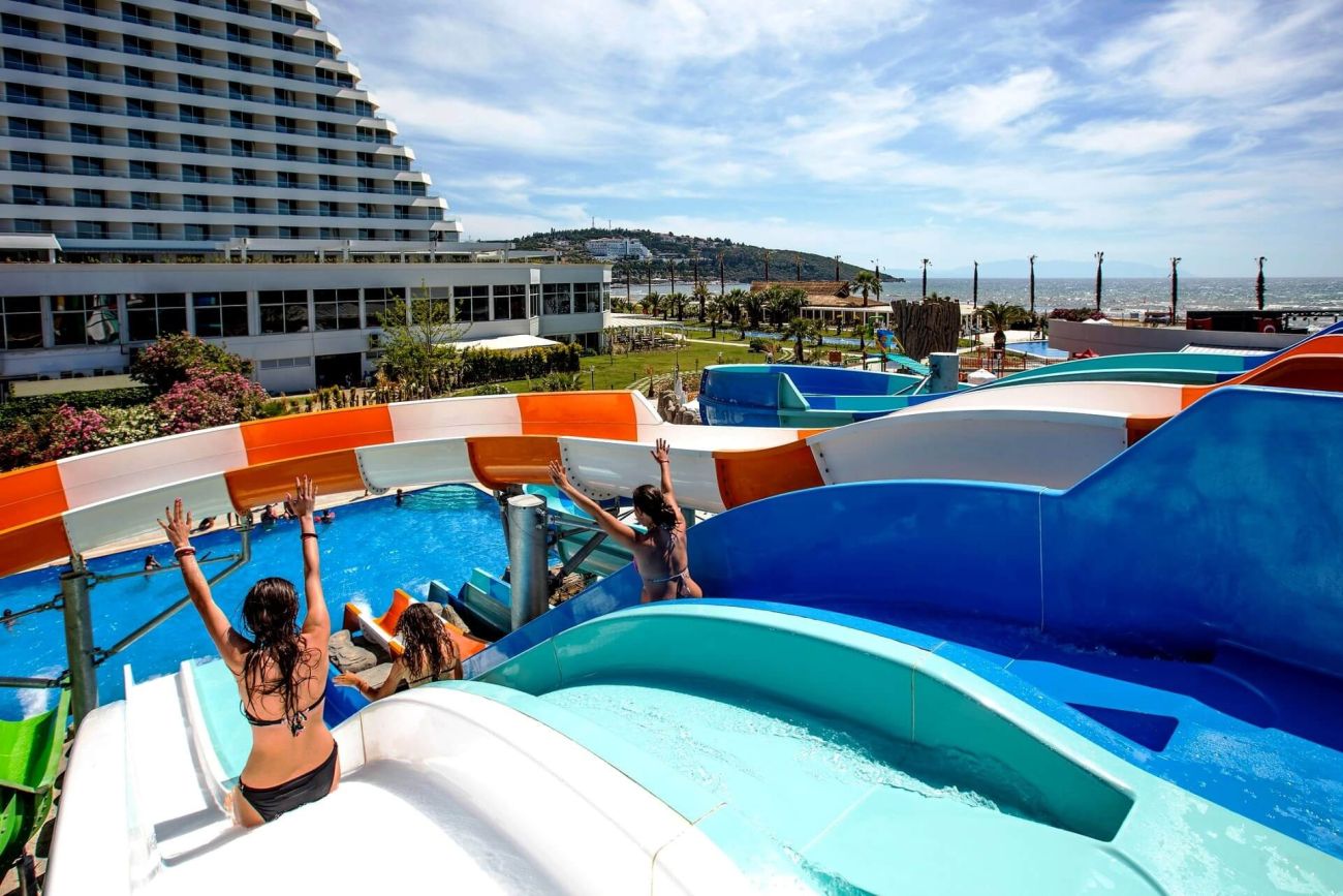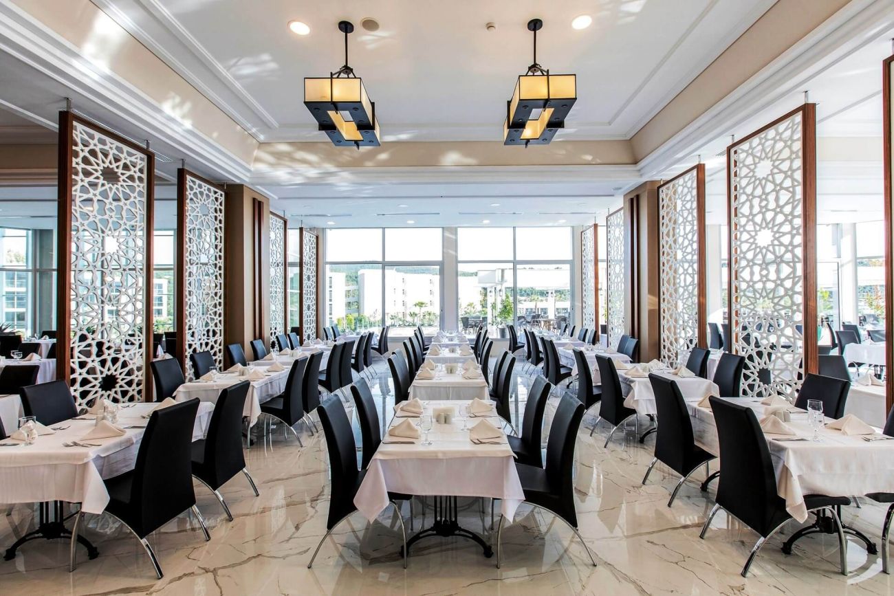 Разполага с основен ресторант, 3 а-ла-карт ресторанта (рибен, италиански, турски - с предварителна резервация; безплатно посещение на един от ресторантите при едноседмичен престой), снек ресторант, гьозлеме, сладкарница, лоби бар, бар басейн, релакс бар, снек бар, диско бар, общо 10 открити басейна със 7 водни пързалки, 1 основен открит басейн - 1200 м2, релакс басейн - 500 м2, закрит басейн - 140 м2 и детски басейн с водни пързалки - 200 м2.
