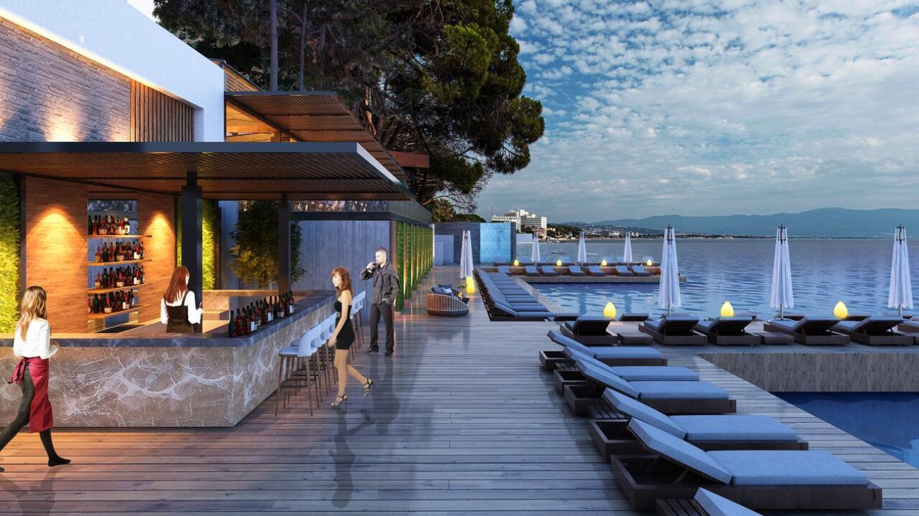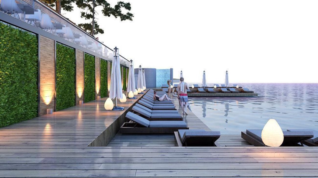 Собствен плаж, изграден на платформа, от която се влиза в морето по стълбички, с безплатни чадъри и шезлонги.