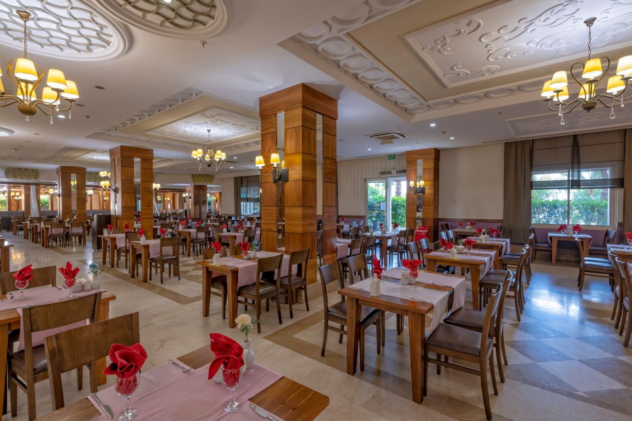 На територията на хотела се намират основен ресторант, 3 а-ла-карт ресторанта ( италиански, турски, мексикански, с предварителна резервация, за едноседмичен престой едно безплатно посещение ), 5 бара, открит басейн, закрит басейн, 3 водни пързалки, лекарски кабинет, СПА-център, фризьюорски салон, търговска алея, пералня, 4 конферентни зали.