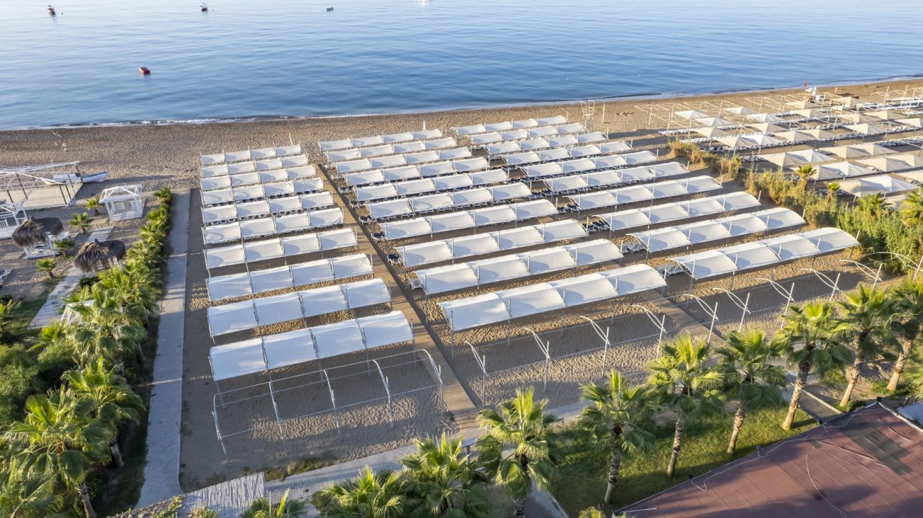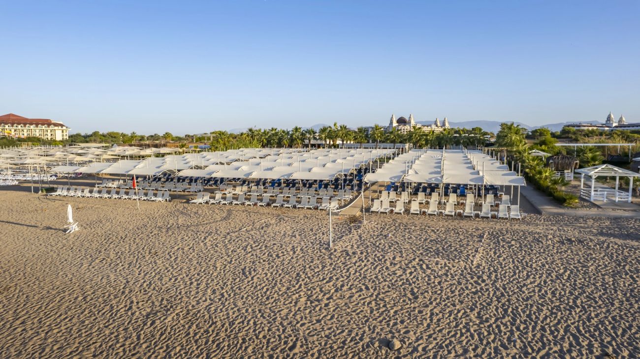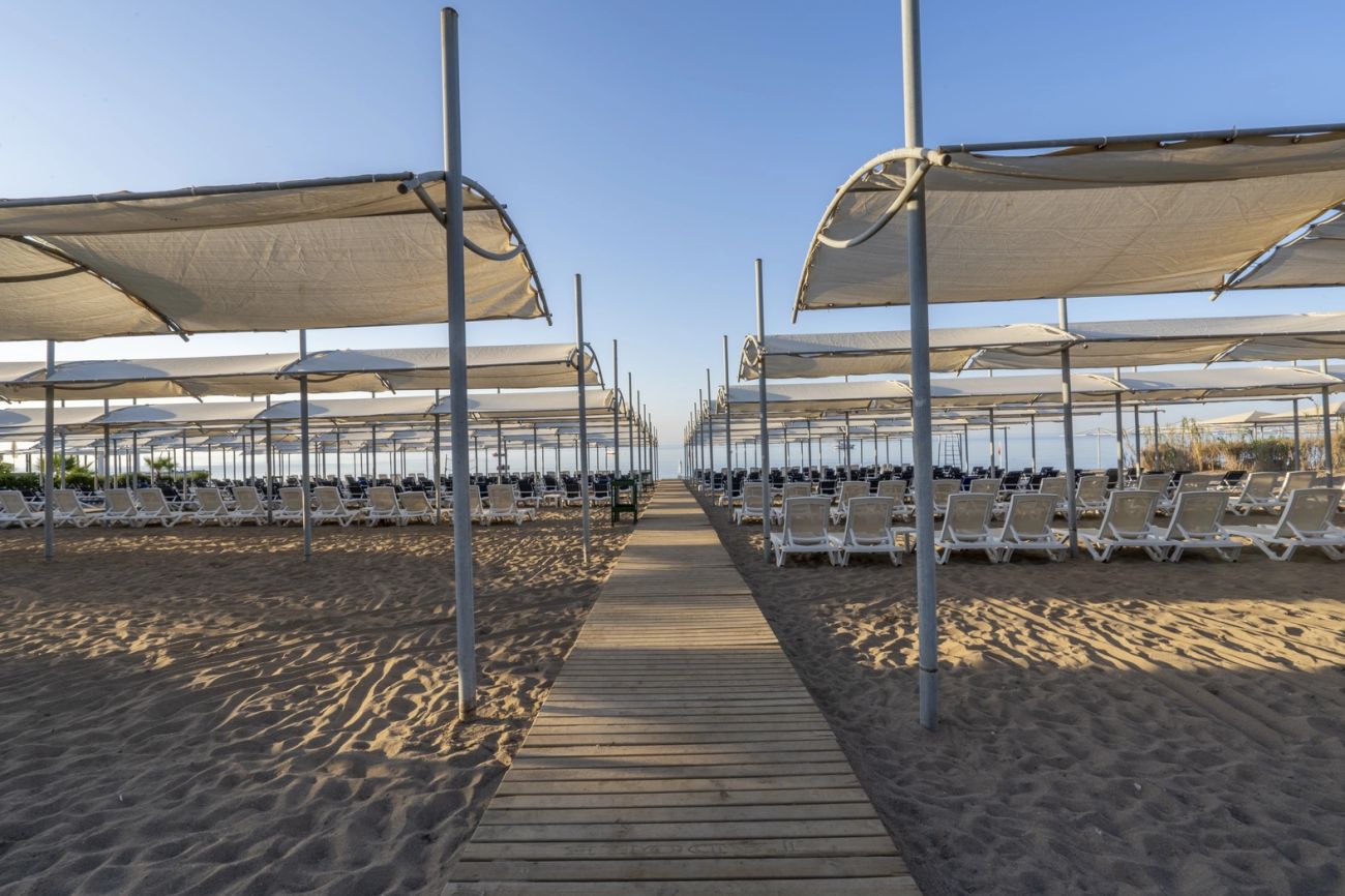 Собствен, пясъчен на 300 м от хотела. Чадъри, шезлонги и матраци на плажа и при басейните - безплатно.