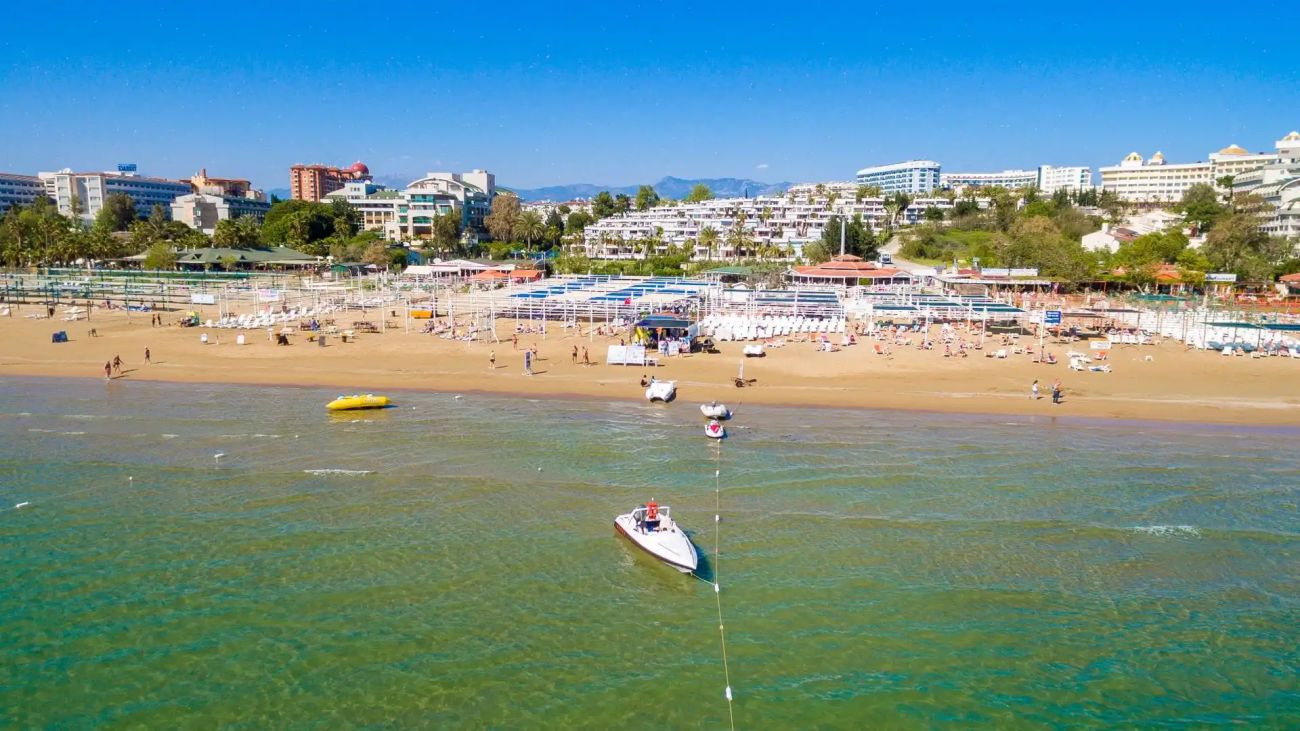 Частен плаж на 1750м от хотела с фин пясък с плавен вход в морето, подходящ за семейства с деца. Безплатен шатъл (около 4 минути път). На плажа – бар и снек-бар, шезлонги, чадъри и плажни кърпи (включени в цената).