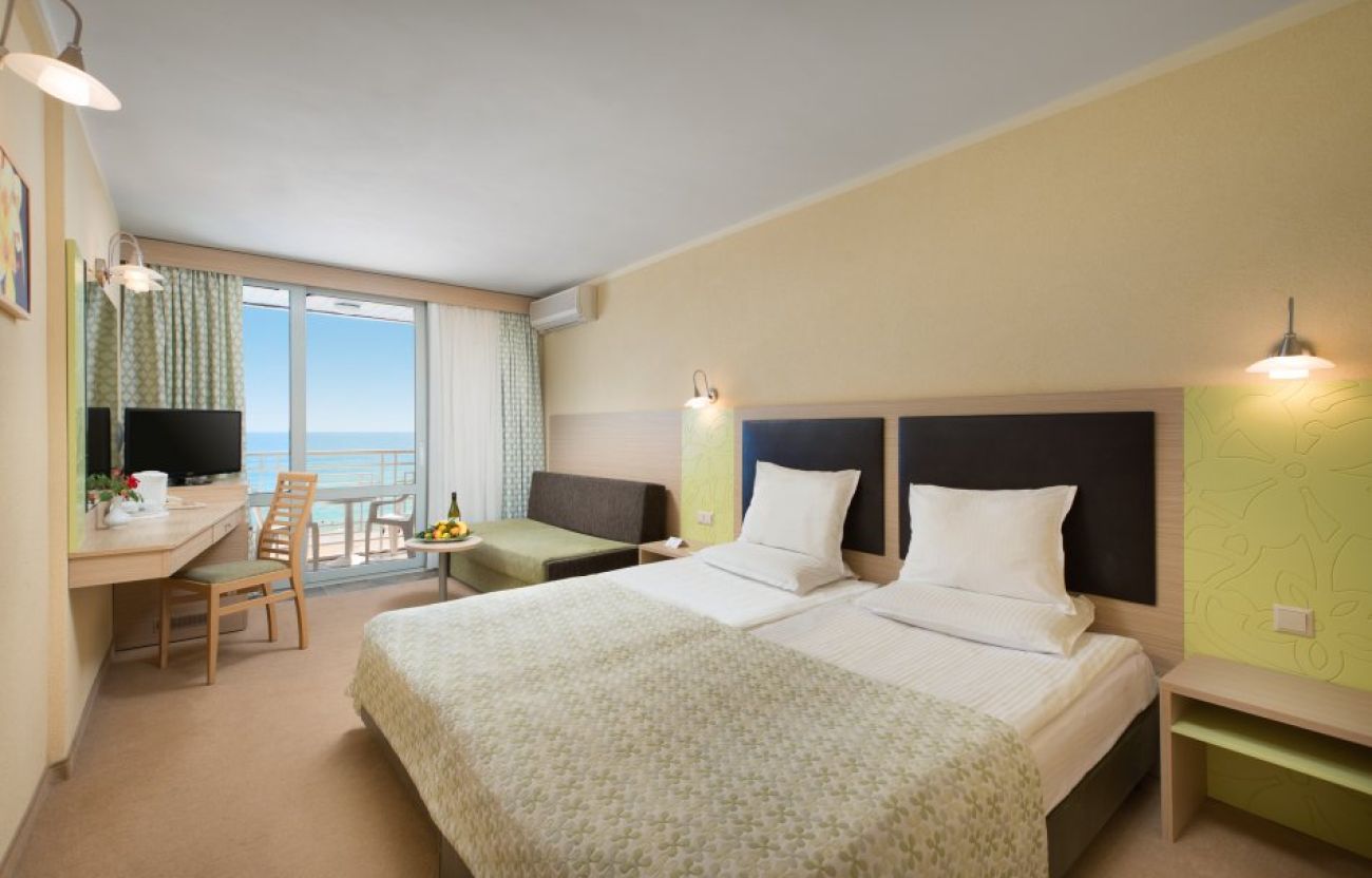 Стаи с морски изглед (около 17 кв.м.) - уютно и комфортно обзаведени с неповторима панорамна гледка към морето. По голямата част от стаите разполагат с две стандартни (единични) легла и разтегателен диван. Останалите разполагат с едно френско легло (тип спалня), разтегателен диван и баня с вана или душ кабина. Някои от стаите са с междинна врата. Настаняване 3-ма възрастни и 1 дете или 2-ма възрастни и 2 деца.