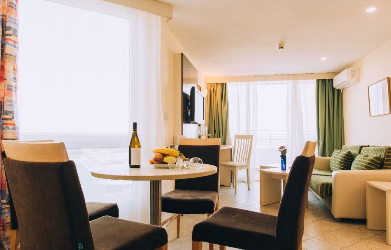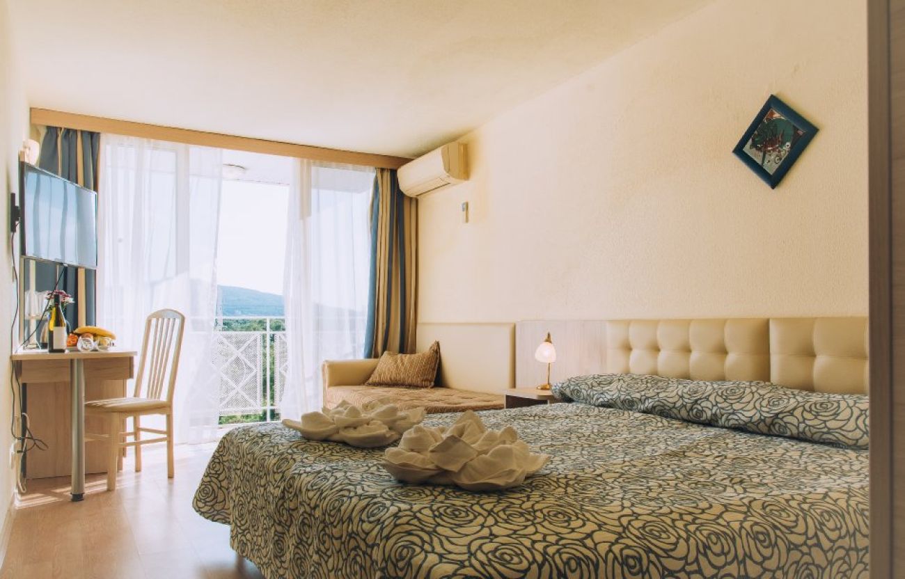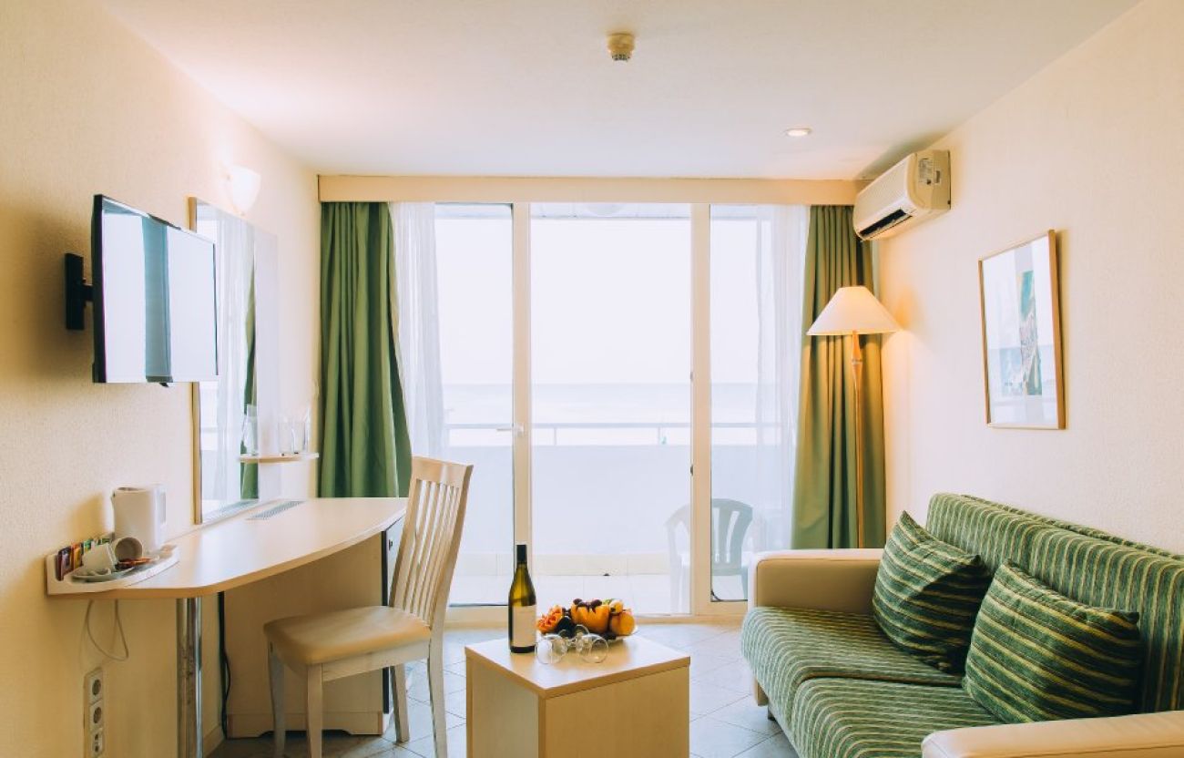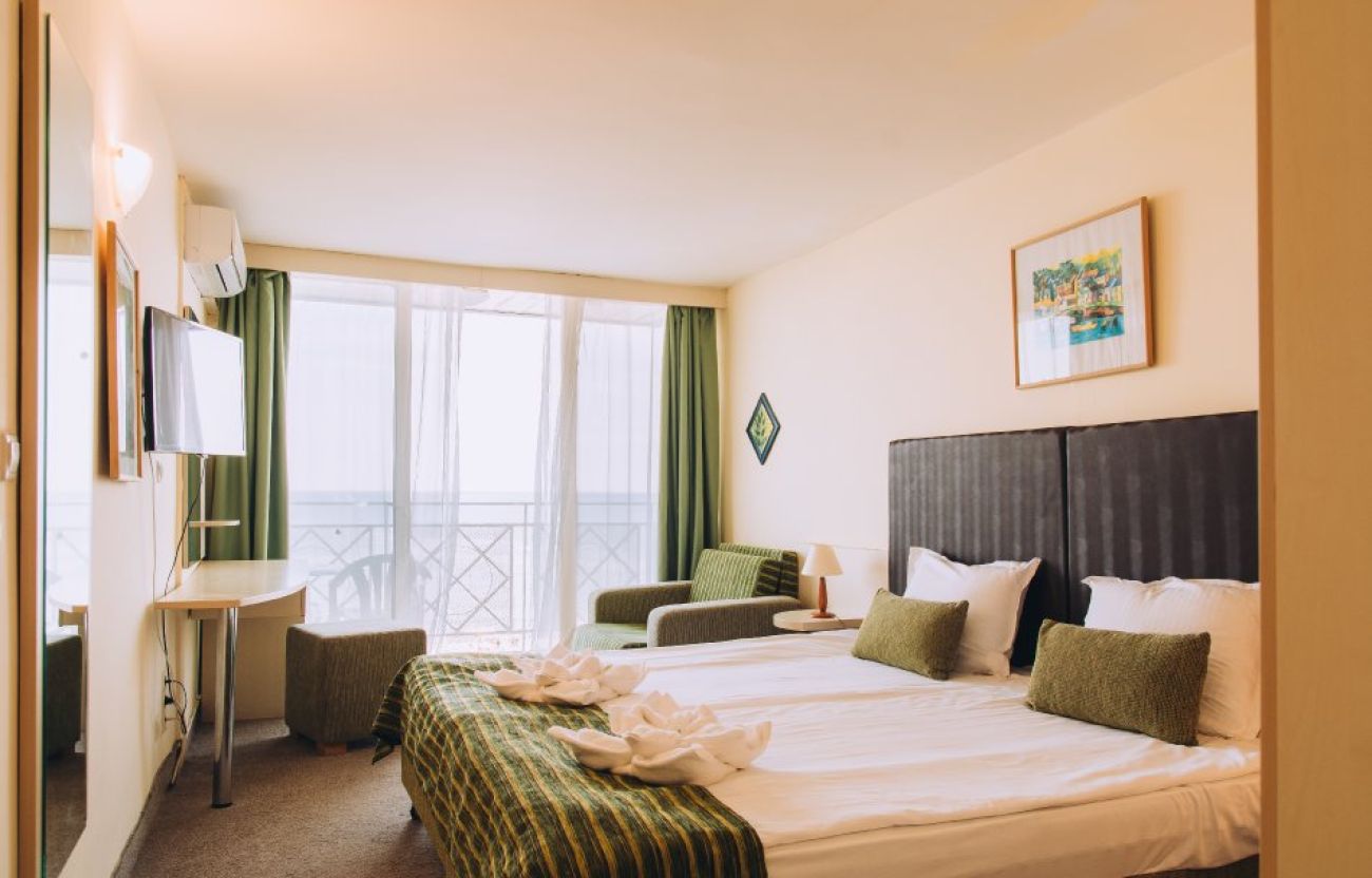 Стаи с морски изглед:(около 18 кв.м.)- уютно и комфортно обзаведени и неповторима панорамна гледка към морето. По голямата част от стаите разполагат с две стандартни единични легла и диван. Баните са с душ кабина и тоалетна. Хотелът разполага и със стаи с междинна врата, както и със стаи с двуетажни легла, подходящи за настаняване двама възрастни и 1 дете или двама възрастни и 2 деца.