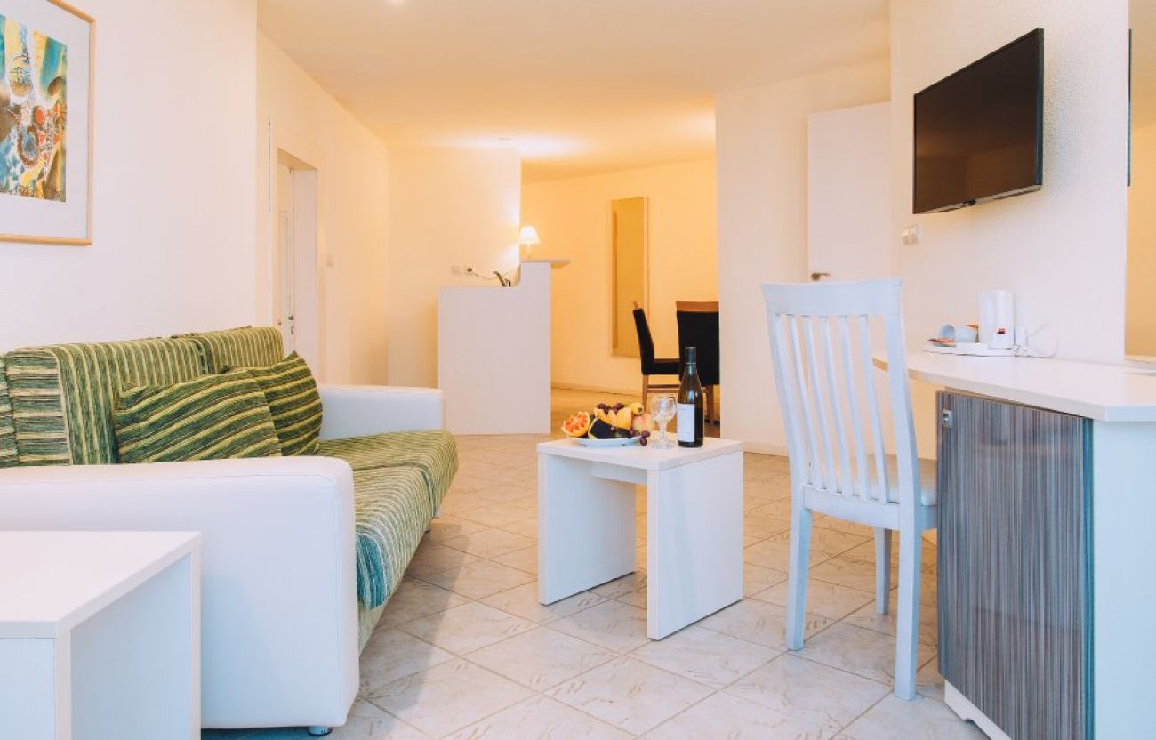 Едностаен апартамент:(40 кв.м.)- комбинация от спалня, хол, баня с вана и две тераси с панорамен морски изглед. Луксозно обзаведени и позволяващи настаняване на двама възрастни и 2 деца.
