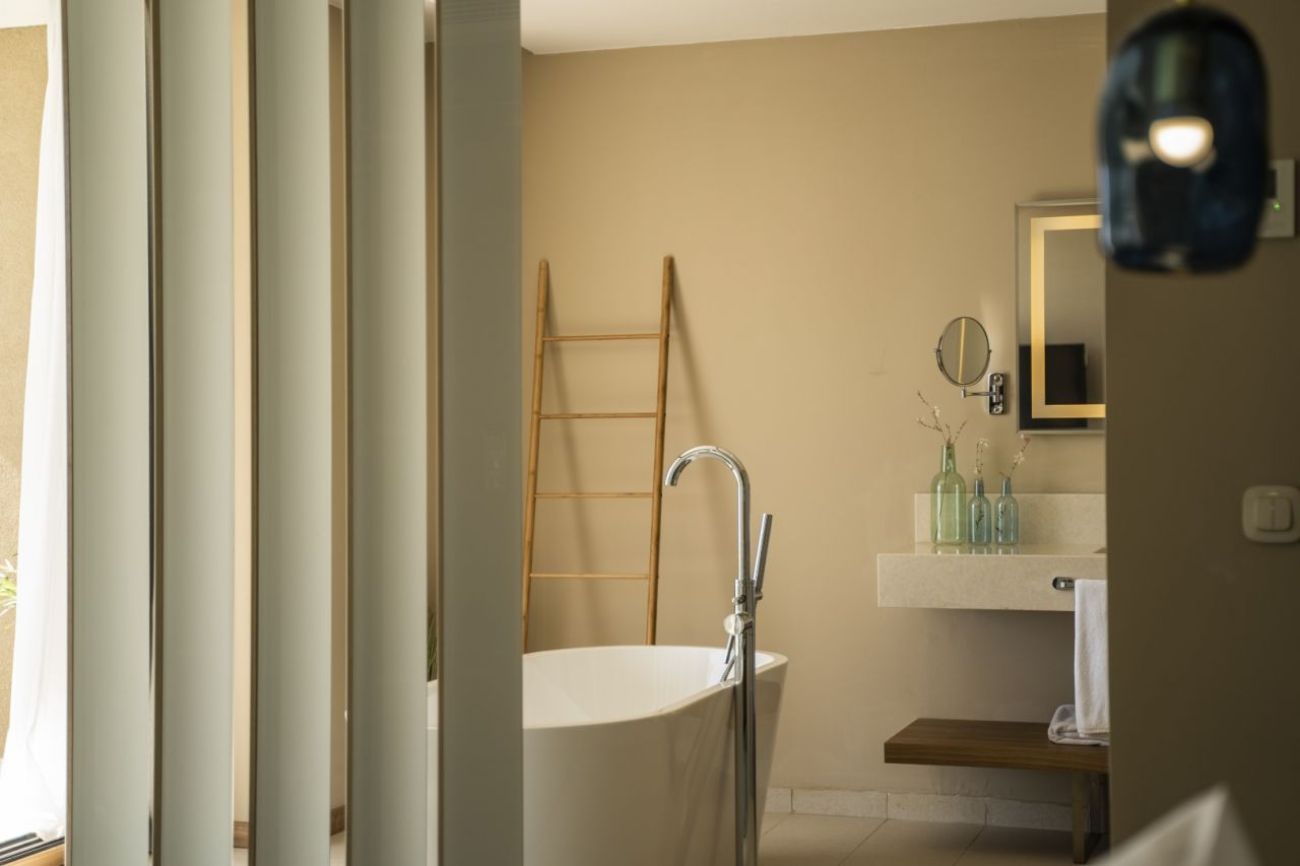 Дизайнът на стаите е модерен и изтънчен, съчетаващ отворени пространства и чистота на линиите. Меките тонове и естествените материали създават неповторимо усещане за докосване до природата. Баните са с изнесени мивки в общото пространство на стаята и отделен душ, за истинско Спа изживяване. Откритият дрешник внася допълнително функционалност и възможност за удобно съхранение на вещи.