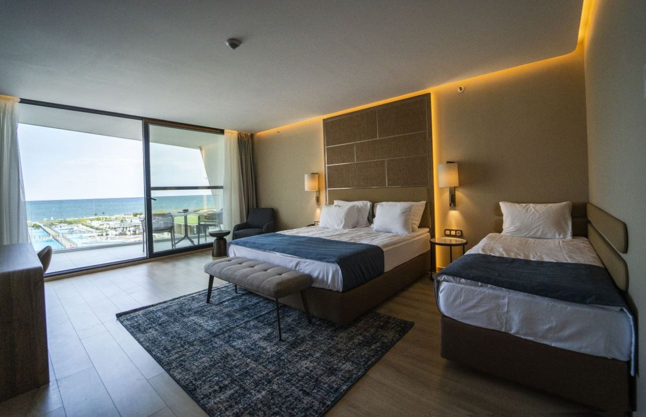МОРСКИ СТАИ (36 КВ.М ПЛОЩ) - Елегантни и просторни, стаите с морска гледа имат площ от 36 м2 и са подходящи за настаняване на двойки или семейства с едно или две деца. Разполагат с двойно легло king-size (180x200 см), единично легло (90x200 см), уютно обзаведен балкон с прекрасна гледка, открит дрешник, луксозна баня, с изнесена мивка в общото пространство на стаята.