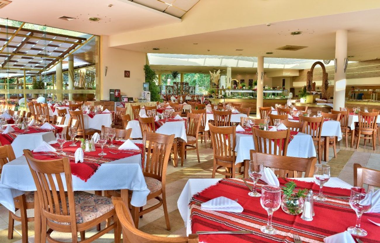 - Вечеря на блок маса -19:30 – 21:30 часа - съчетава вкусовете на европейската и световна кухня с предложение от богат салатен бар и прясно приготвени пред Вас риба, меса и ястия, включително вегетариански и диетични. Две тематични вечери в седмицата с вкусни десерти, свежи плодове от малки местни производители, асортимент сладолед. Барбекю на дървени въглища 6 дни в седмицата.