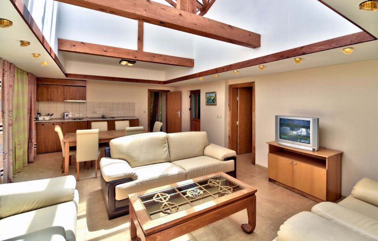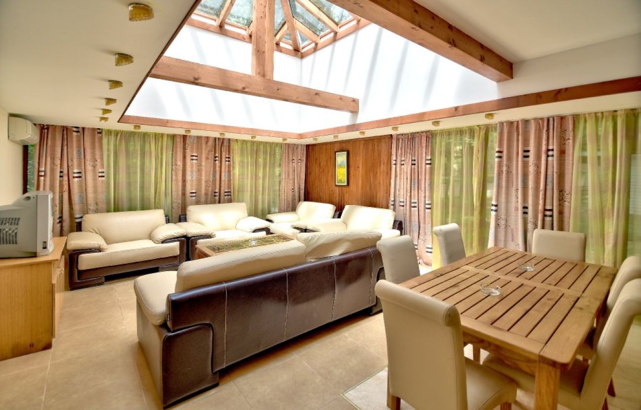Всяка вила Лотос разполага с 3 самостоятелни спални помещения с уютен интериор и модерна обща дневна с остъклен таван. Всяка от трите спални е обзаведена с комфортно двойно легло, удобен диван, подходящ за спане на дете до 12 г., нощни шкафчета, бюро с огледало, хладилник, LЕD телевизор с кабелна телевизия, телефон, климатик, баня с вана, сешоар. За максималния комфорт на гостите всяка спалня има самостоятелен вход към общия двор, а две от тях и втора врата към хола. Просторният хол съчетава кухненски кът, кът за хранене с голяма маса с удобни столове и кът за сядане с мека мебел. Максимален капацитет 6 възрастни и 3 деца.
