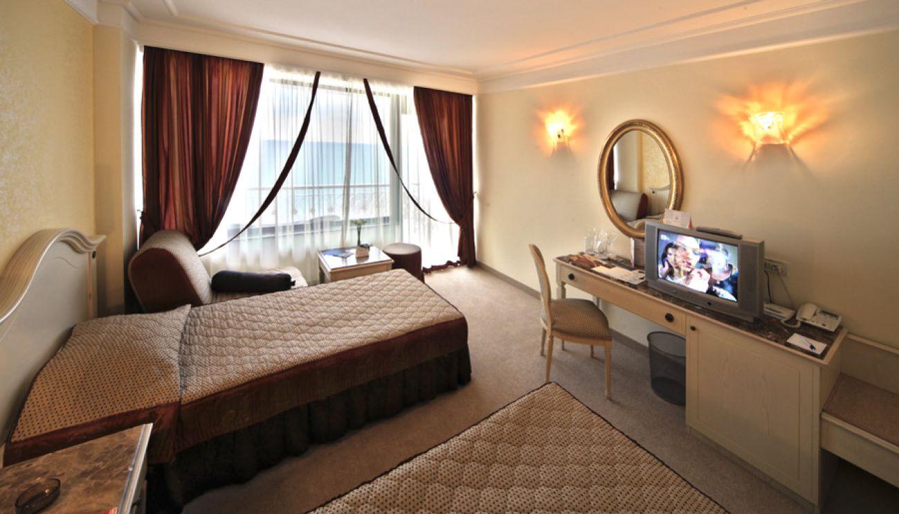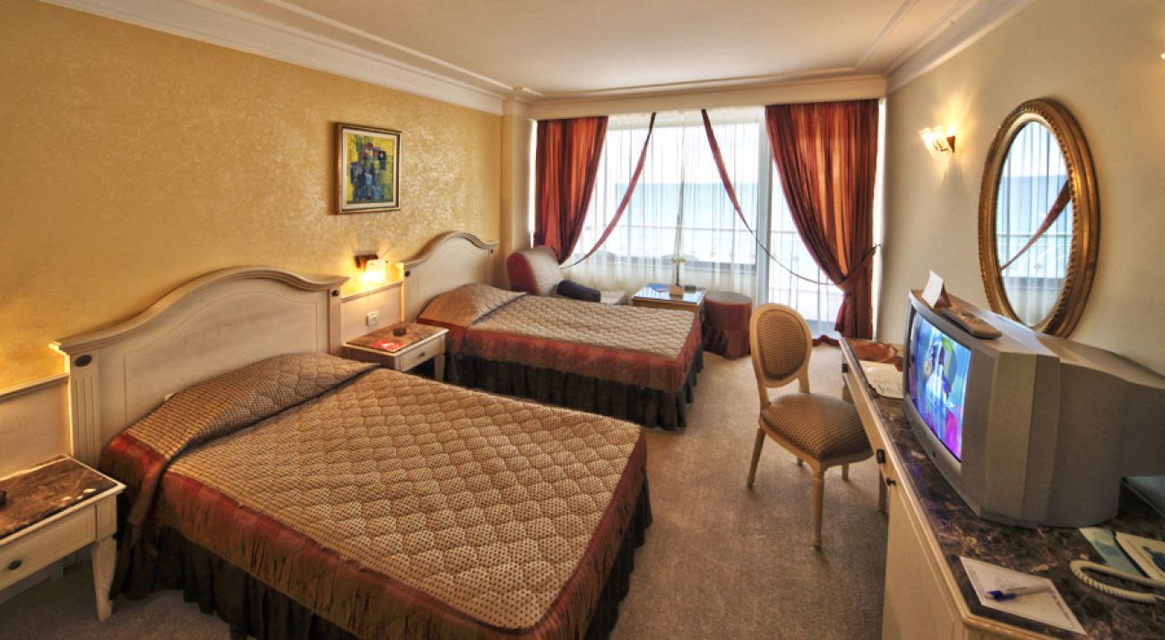 112 двойни хотелски стаи, 31 апартамента, 2 президентски апартамента, Балкони, Баня, WC , Климатик, Телефон с директно избиране, Мини-бар, Кабелна телевизия, Сeшоар