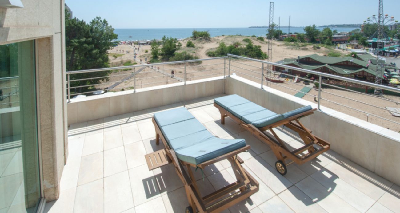 VIP апартамент - 100 м2 с просторна тераса с шезлонги. 3 помещения, 2 спални, обширна дневна с работен кът, диван, домашна камина, кухненски кът, кът за хранене, 2 санитарни възела. Максимален капацитет 6-ма възрастни.