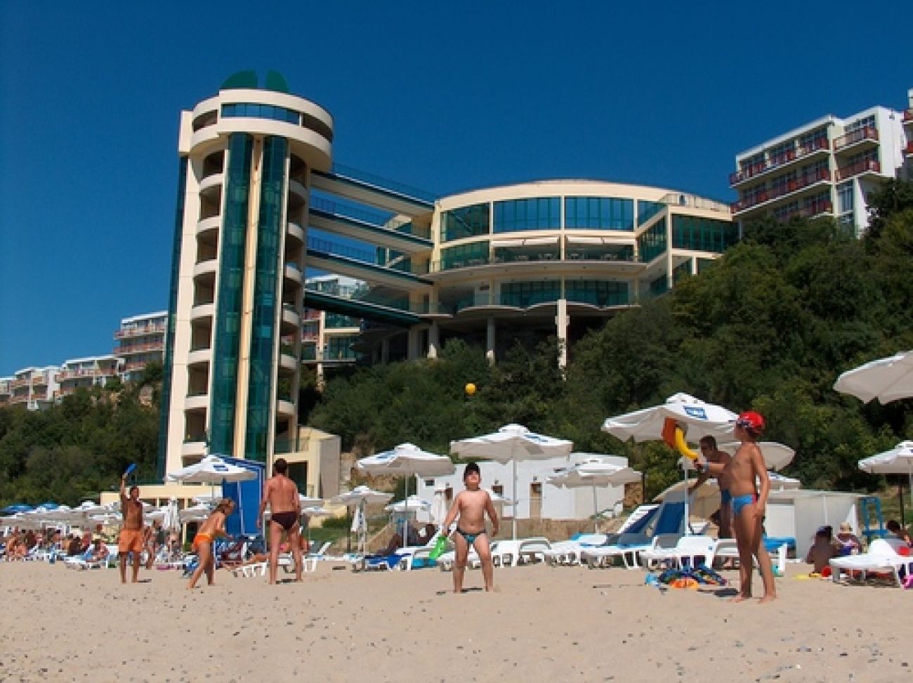 Ваканционен клуб Парадайз бийч е разположен върху площ от 40 000 кв.м. и се състои от няколко четириетажни сгради, обединени в елегантен ансамбъл. Атракция за гостите на комплекса са панорамните асансьори, които отвеждат направо на пясъчния плаж. На разположение на гостите са разнообразни възможности, както за спорт, така и за релакс и тонизиране. Аква-аеробика, тенис, фитнес, плажен волейбол, водни джетове, скачане с парашут, уинд сърф или отпускащи масажи, сауна, турска баня – това са само част от многобройните дневни развлечения на плажа. Много игри и забавления очакват най-малките гости на комплекса на детската площадка, в детската градина или на плажа. За доброто настроение се грижи екип от професионални аниматори както през деня, така и вечер с развлекателни програми на живо в открития амфитеатър.