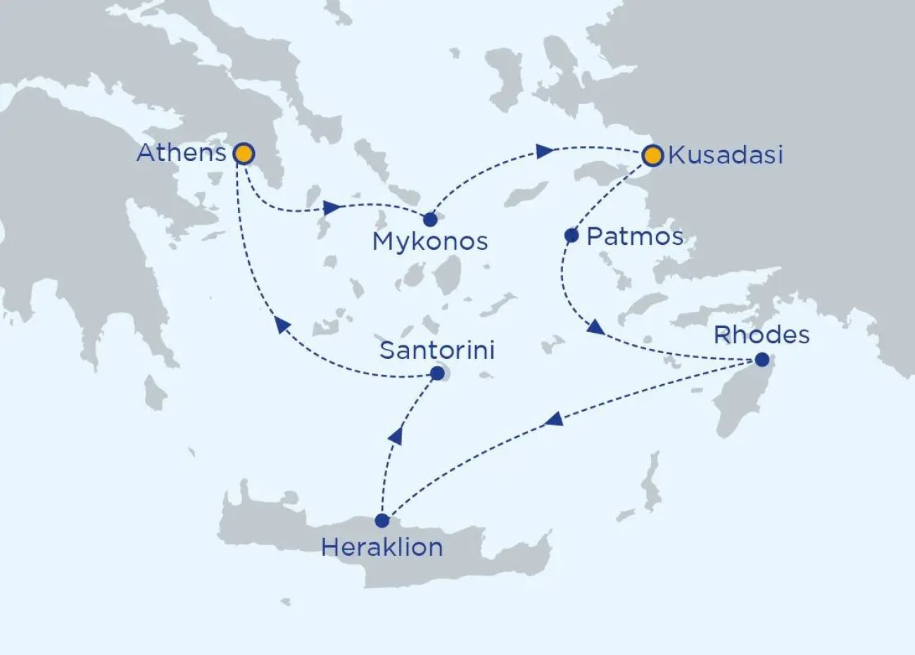 София-Лаврион/Атина–о.Миконос–Кушадасъ/Eфес–о.Патмос–о.Родос-о.Крит-о.Санторини–Лаврион/Атина