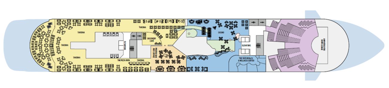 Информация за круизния кораб - CELESTYAL DISCOVERY е луксозен круизен кораб, с модерен дизайн и широк спектър от удобства, всички с комфорта на ултра-модерен и изтънчен круизен кораб. Всички 633 каюти, 62 от които разполагат с балкони, са оборудвани с душ, тоалетна, телефон, сешоар, сейф и телевизор. На круизния кораб има привлекателен амфитеатър с обширно пространство за конференции и събития, колоритно обзаведени салони, специализиран ресторант Grillseekers, уелнес център Sozo, обширна палуба с басейн с ексклузивна палуба Rays, Greek Deli и Fig & Honey бар за сладолед и натурални напитки.