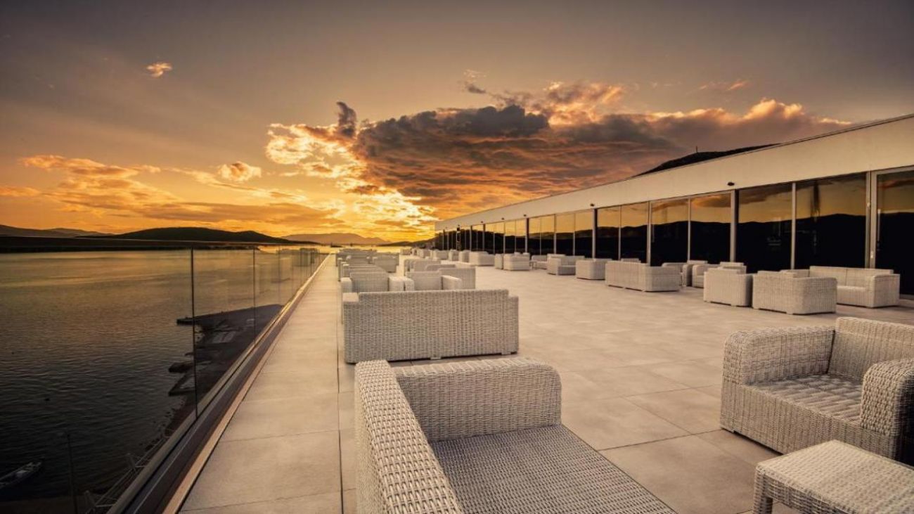 Тераса с прекрасна гледка към морето, където гостите могат да се насладят на напитки или просто да релаксират.