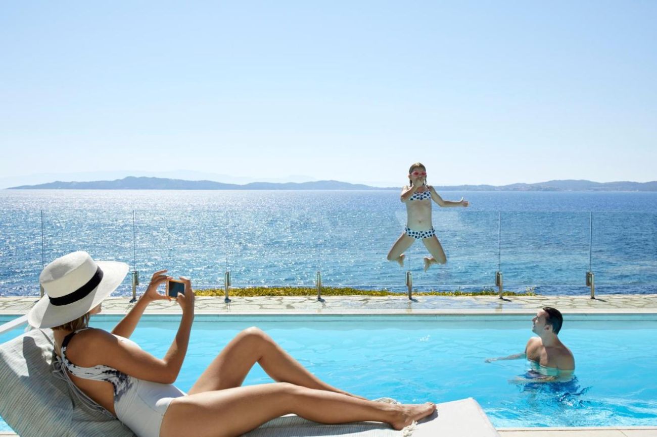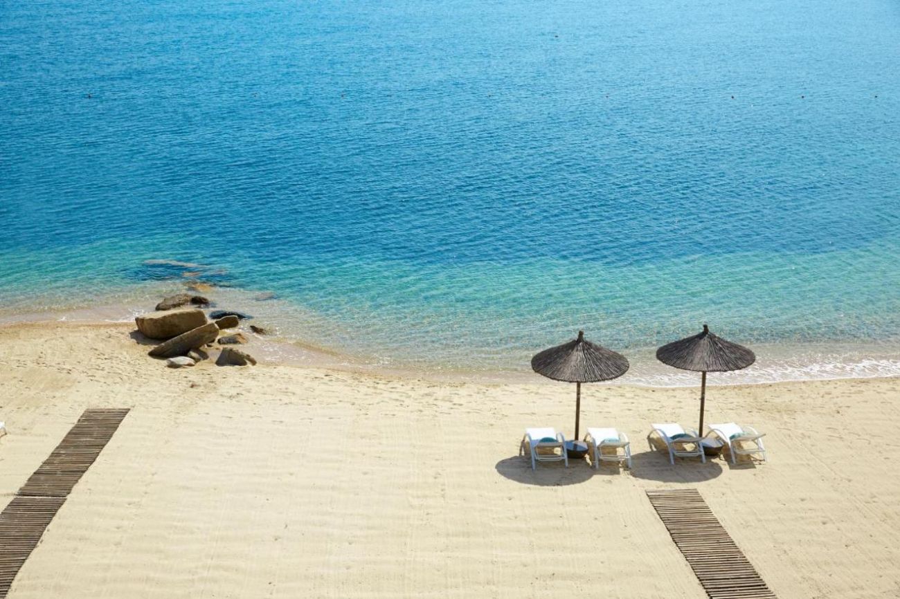 Grand Sea Front Suite with Private Pool Състои се от спалня с всекидневна зона и втора спалня. 2 мраморни бани. На разположение са 2 телевизора (LCD), мини бар, кафе машина за еспресо. В спалните - отделен изход към тераса с частен басейн. Пряк изглед към морето, пътека от терасата се спуска към морето. Възможно настаняване: до 4-ма души.