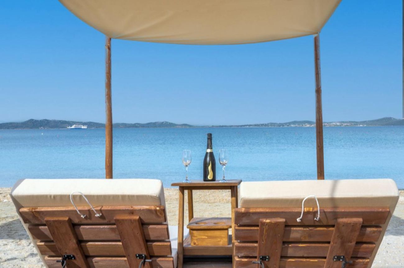 Стига се по мост до пясъчно-чакълест плаж, който се намира на 100 метра от хотела. Чадъри, шезлонги, плажни кърпи - срещу заплащане.