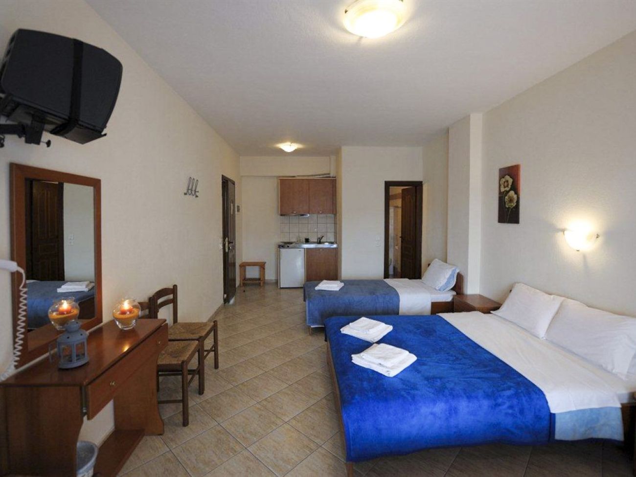 Стаи: оборудван кухненски бокс (с изключение на единичните стаи), хладилник, отопление, климатик, телефон, сателитна телевизия (международни канали), безплатен Wi-Fi достъп до интернет, сешоар, душ, балкон с изглед към морето.