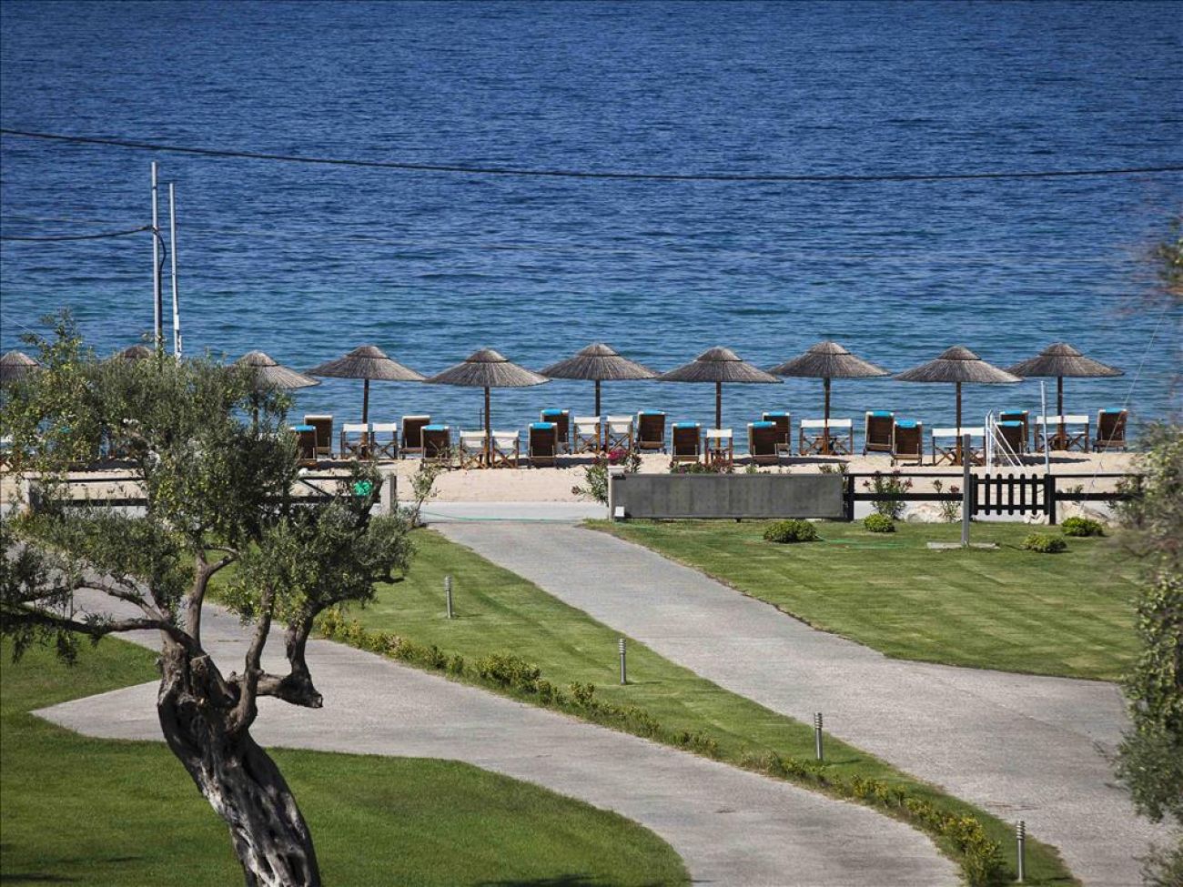 Пясъчен плаж на 70 метра, оборудван с чадъри и шезлонги.