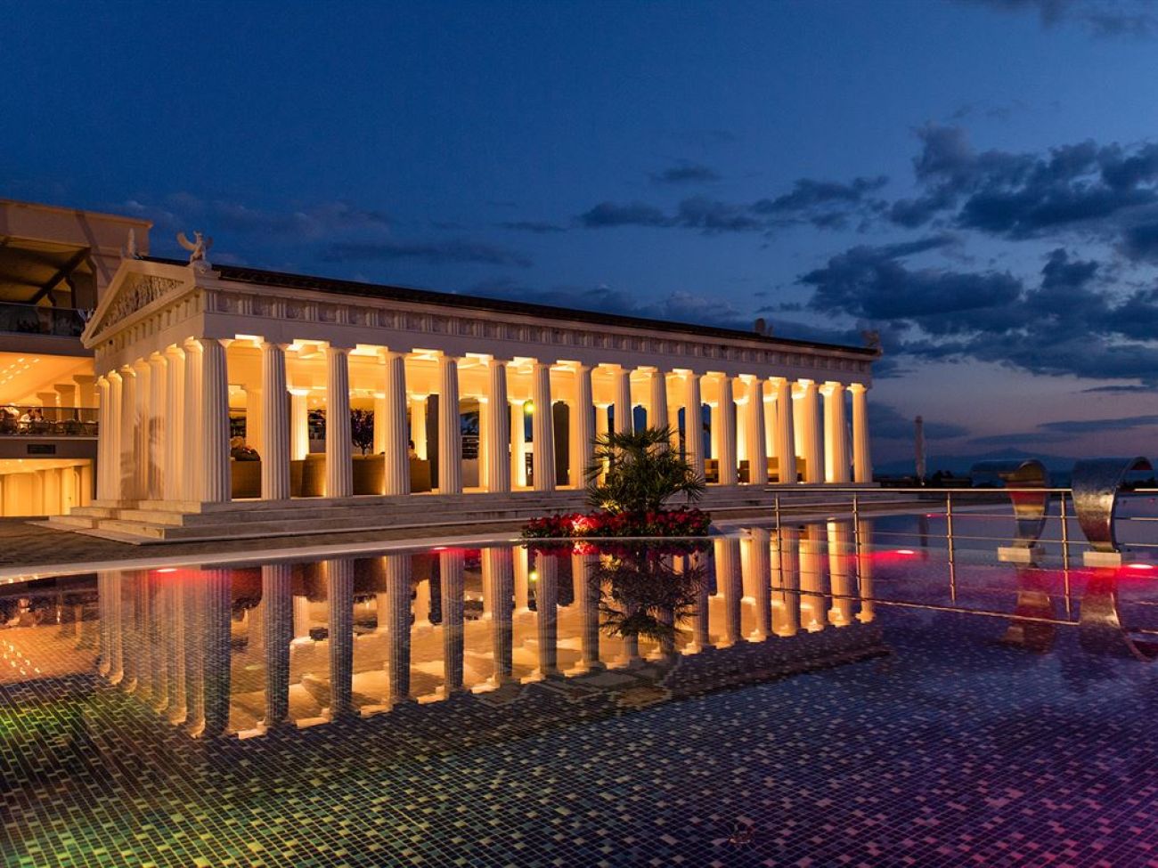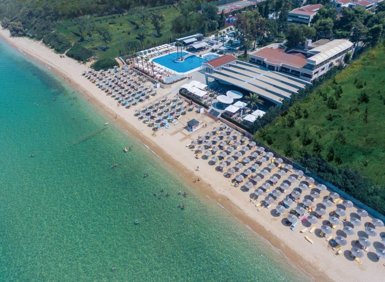 Изисканият хотел Potidea Palace 4*+ е разположен на великолепно място: на живописен провлак между два залива, до самото море, с неповторим панорамен изглед към планината Олимп. Архитектурата на сградата хармонично се вписва в заобикалящата природа.