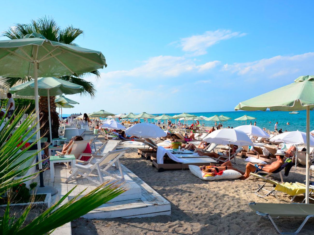 Пясъчно-чакълест до хотела, чадъри и шезлонги (срещу заплащане).