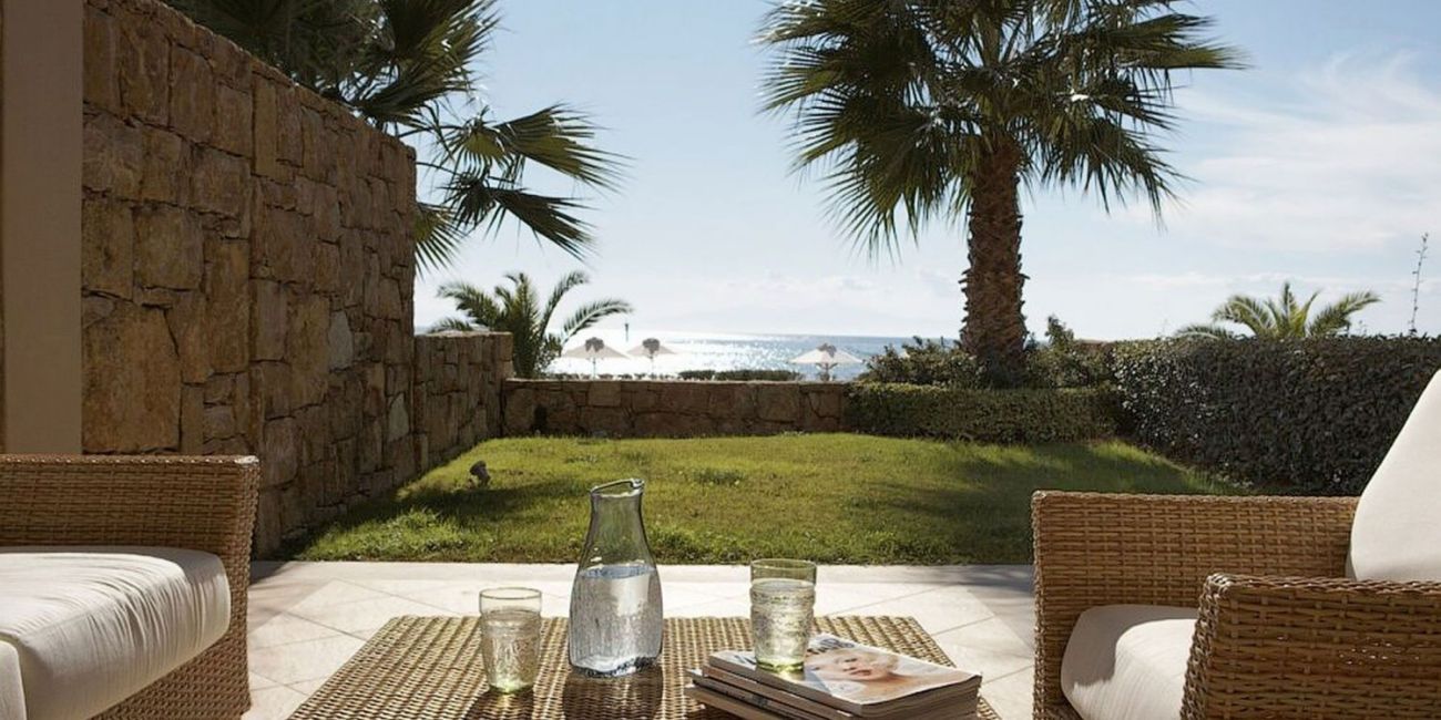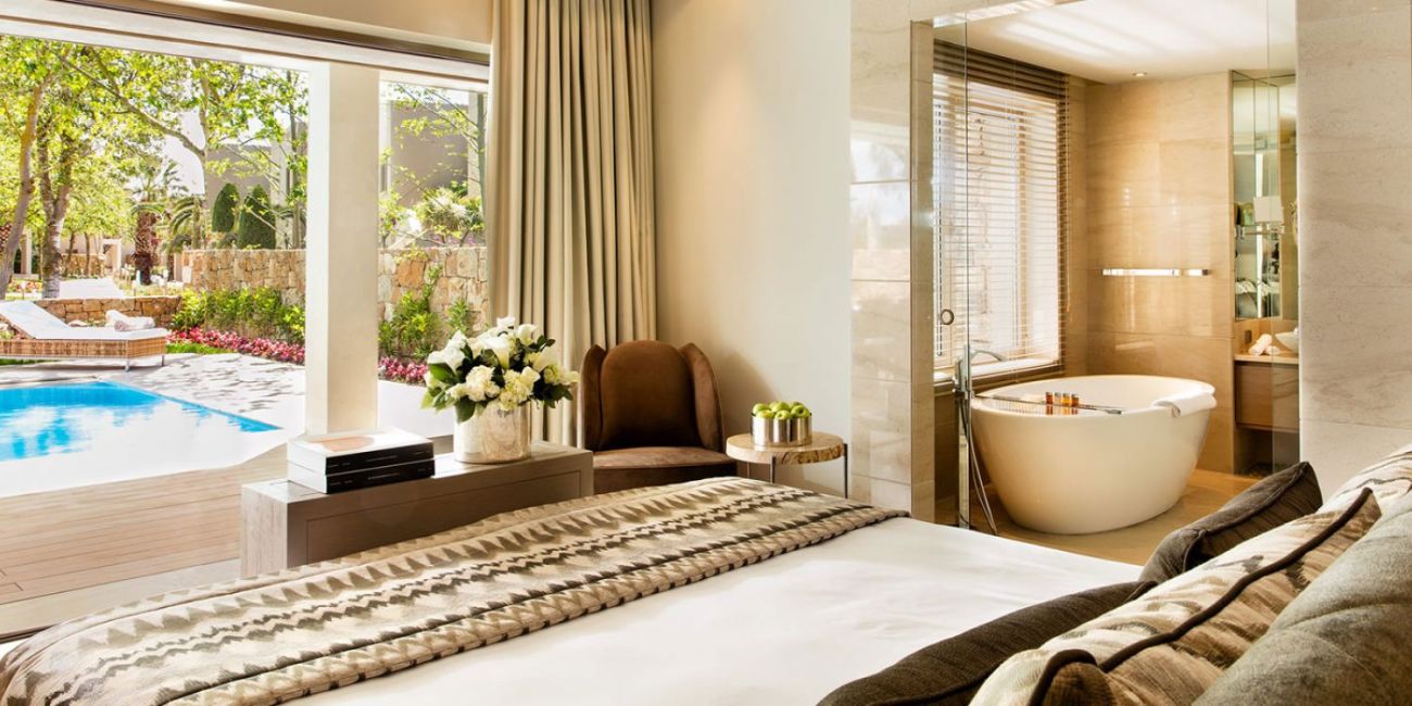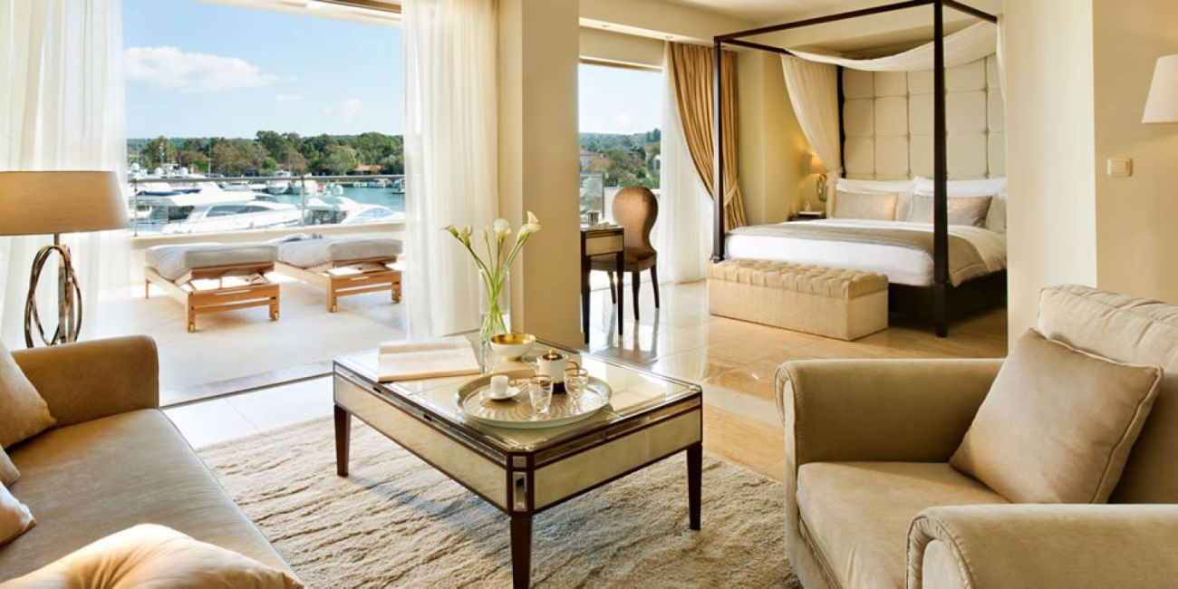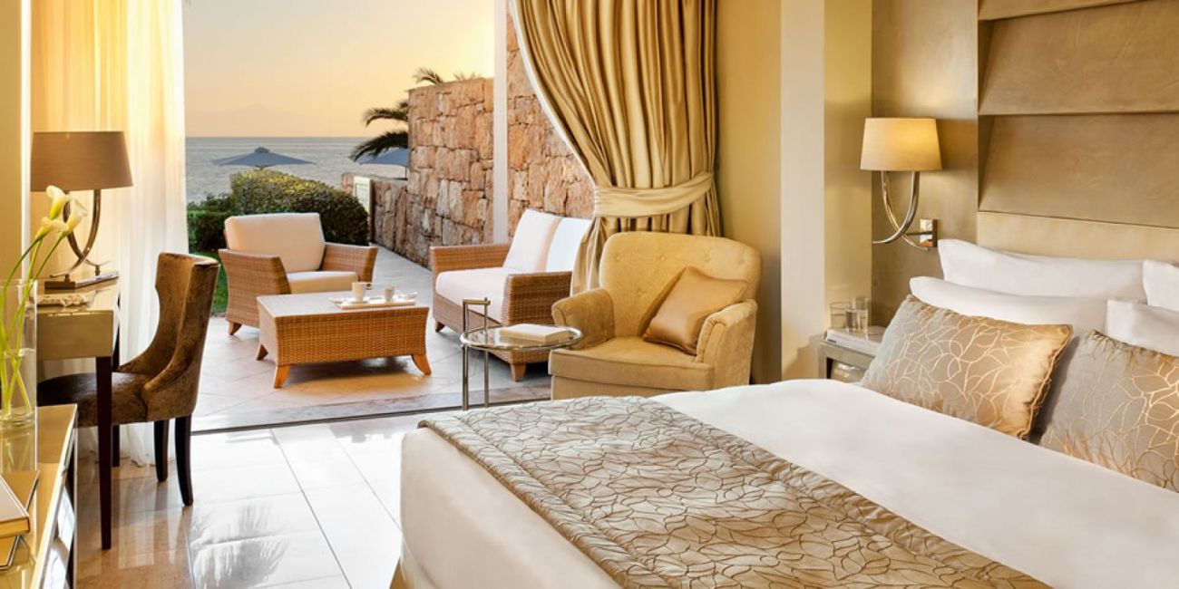 В стаите са на разположение: френски прозорци с великолепен изглед към Егейско море и планината Олимп или живописния залив. Просторни мраморни бани, джакузи и отделна душ кабина с функция "тропически дъжд", 2 мивки, увеличително огледало, сешоар, луксозни висококачествени халати, чехли, включително и за деца, кантар, комплект козметични принадлежности от луксозната марка Anne Semonin, двойно легло с размер Queen-size, ултракомфортни матраци Dream Bed, луксозно спално бельо, одеяла с пух, избор от възглавници. Луксозни италиански мебели. Плазмен телевизор, сателитна телевизия, CD/DVD-плейър, безплатен Wi-Fi интернет, конзоли (PlayStation, Wii), док за iPod и iPhone, телефон, индивидуален климатик, електронен сейф, минибар, набор за приготвяне на чай и кафе, кафемашина Nespresso във всички суити на хотела, балкон/тераса с градина с мебели от ратан. Вечерно почистване на стаите и подготовка на леглата преди лягане, ежедневна преса (по заявка). Денонощен румсървиз.