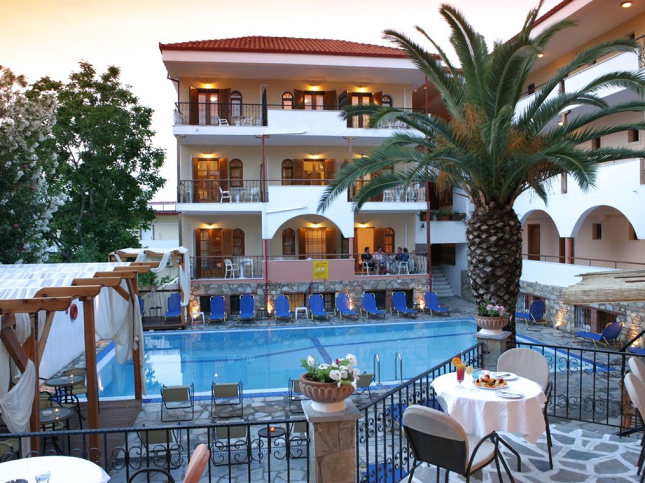 Разположен е на полуостров Касандра, селище Ханиоти, на 85 км. от летище "Македония" в Солун. Изцяло реновиран през 2008 г., стандартните стаи са реновирани и през 2011г., на 300 метра от градския плаж.