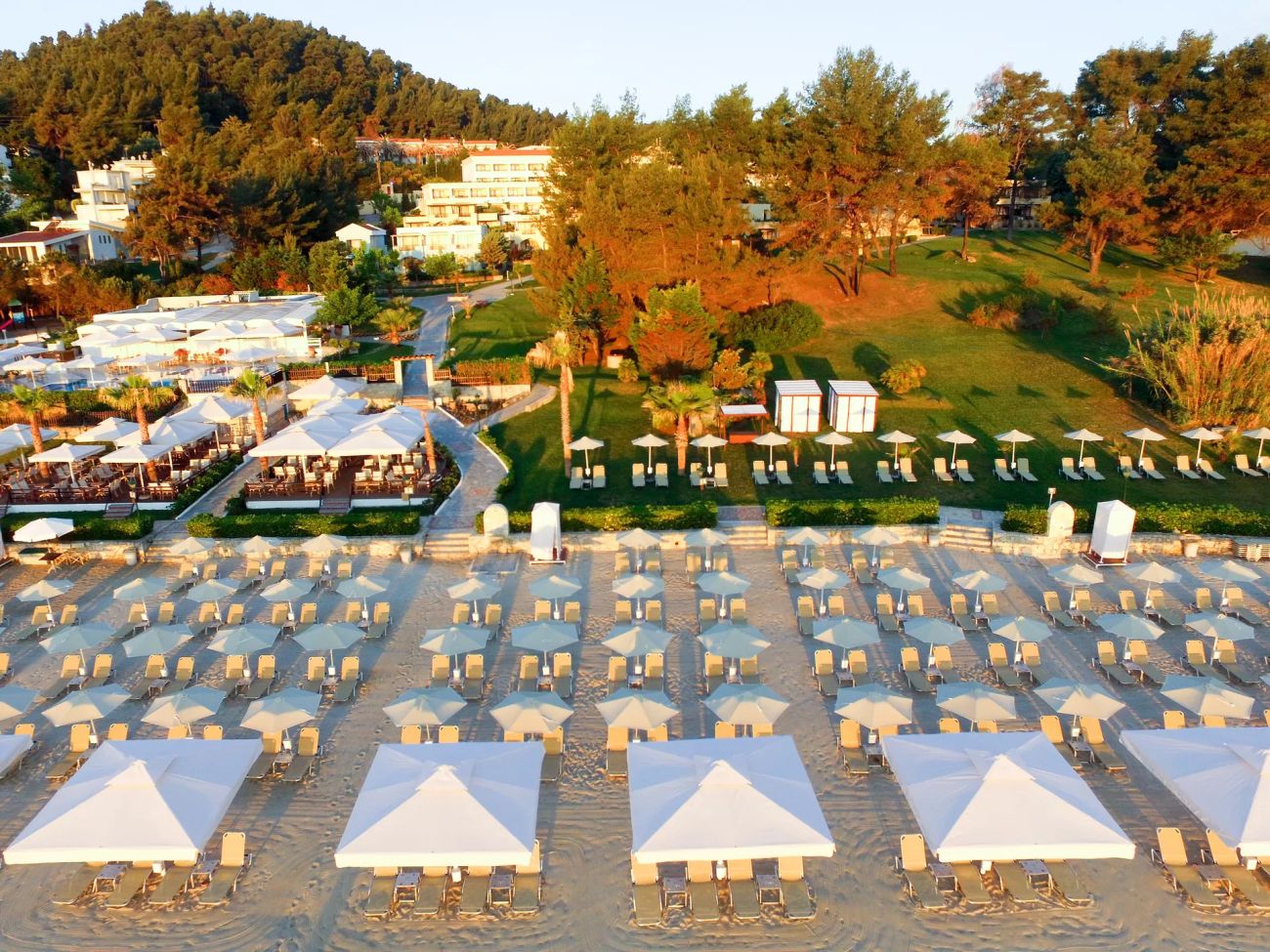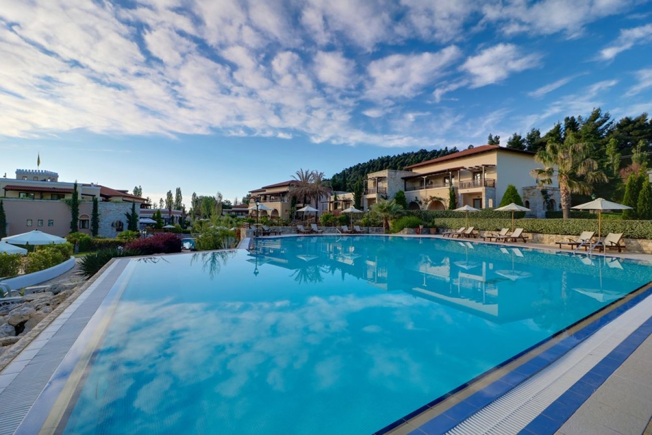 На разположение на гостите на хотела са 9 басейна (8 - с морска вода, един от тях с джакузи и 1 с прясна вода). В стаите с частни басейни - прясна вода, Wi-Fi интернет, 3 конферентни зали с техническо оборудване: Македония - 550 места, Alexandros - 250 места, Vergina - 150 места, заседателна зала (без техническо оборудване) - 20 места, мини-маркет и бижутерия, масаж, сауна, турска баня (хамам), СПА-център- закрит отопляем басейн ( в зависимост от метеорологичните условия с прясна вода, куриерски услуги, факс и секретарски услуги, фитнес зала, химическо чистене/пералня.Два лоби-бара и бар на плажа, 3 бара до басейна, 2 основни ресторанта (един - в корпуса над пътя) - предлага закуска и вечеря - шведска маса, ресторант а ла карт, ресторант на шведска маса. Дрес код за вечеря. Дълги панталони са задължителни за мъжете. За жените не е желателно прекалено къси дрехи или ежедневни облекла.