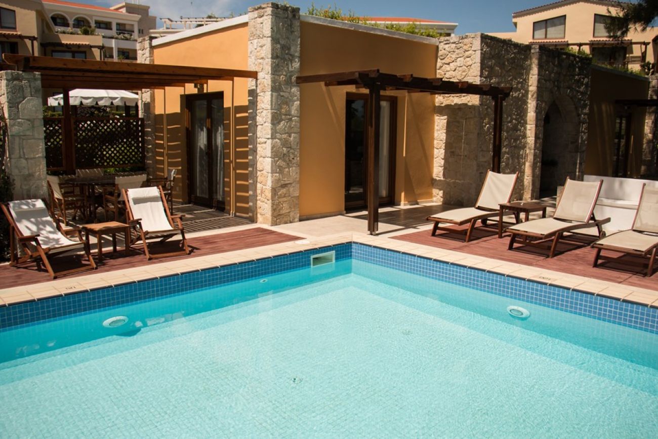 Presidential Suite Отделна къща с частен басейн. Състои се от 3 стаи (всекидневна и 2 спални), 2 бани (в едната - джакузи, в другата - вана). Възможно настаняване: до 4-ма души.