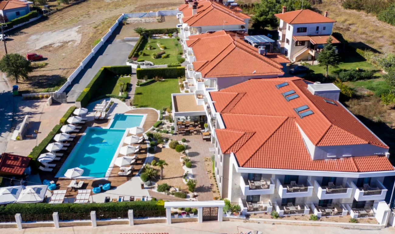 Полуостров Касандра, на 200 метра от центъра на курортно селище Афитос, 72 км. от летище "Македония", на 85 км. от центъра на град Солун.