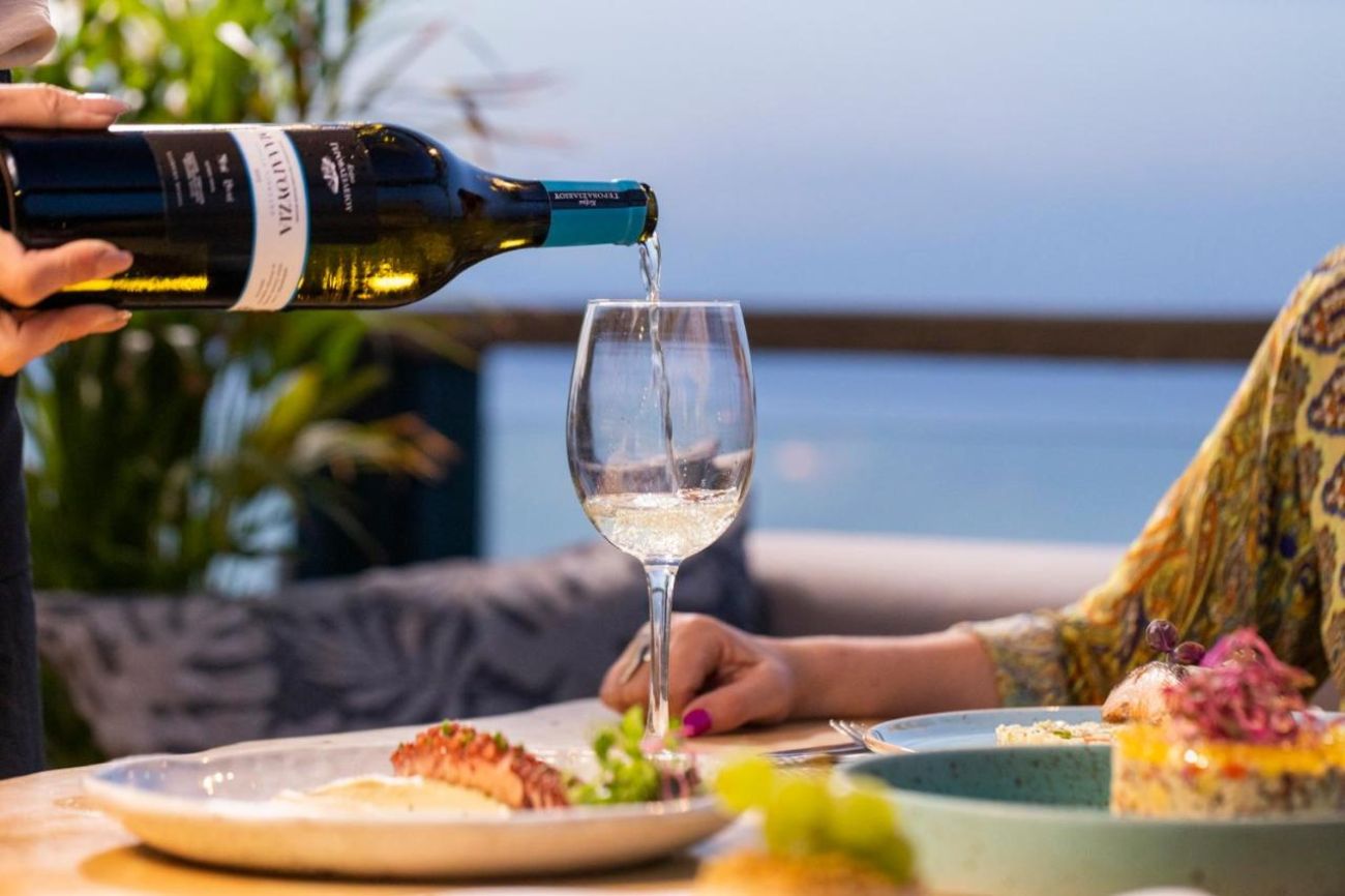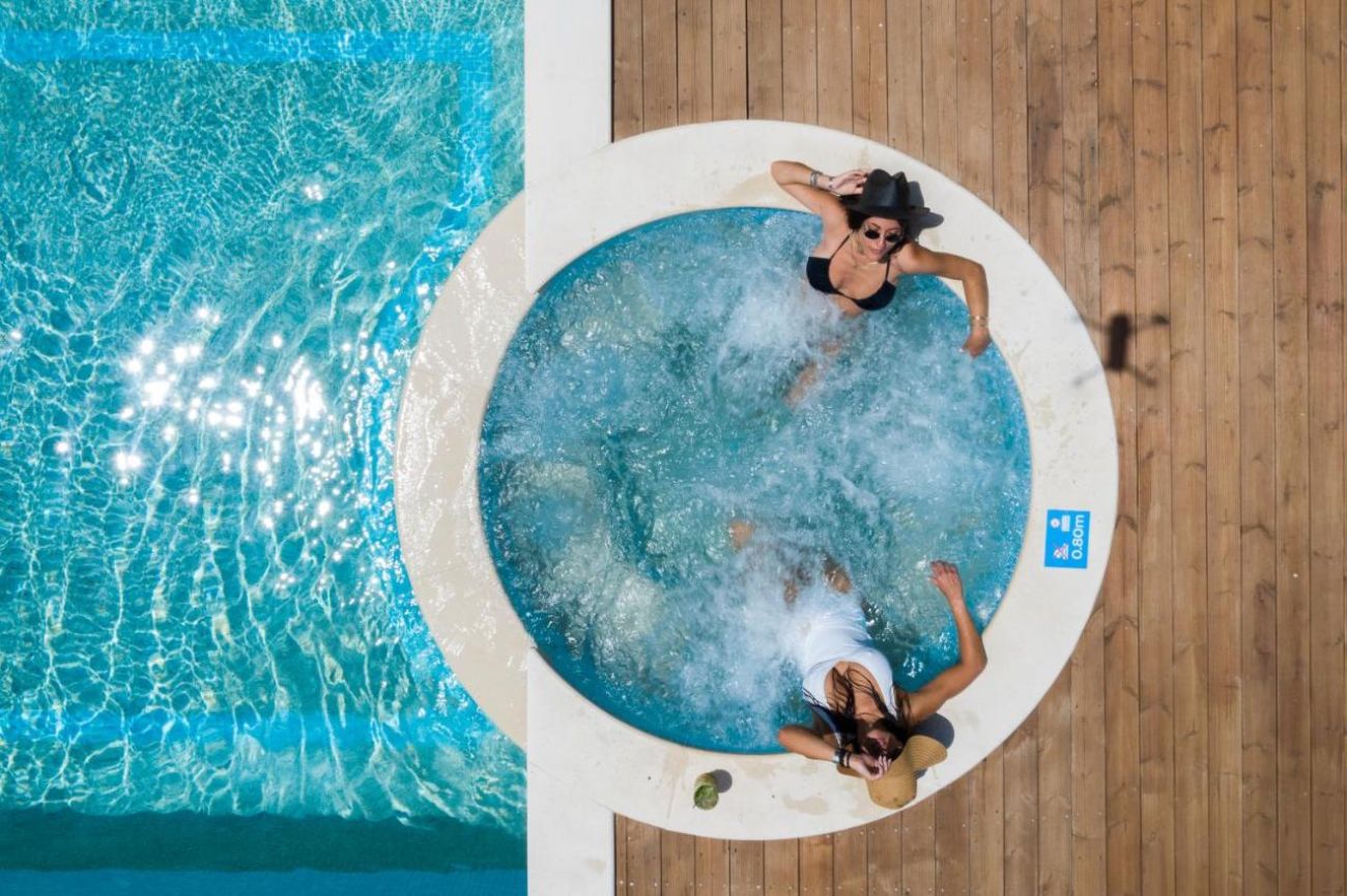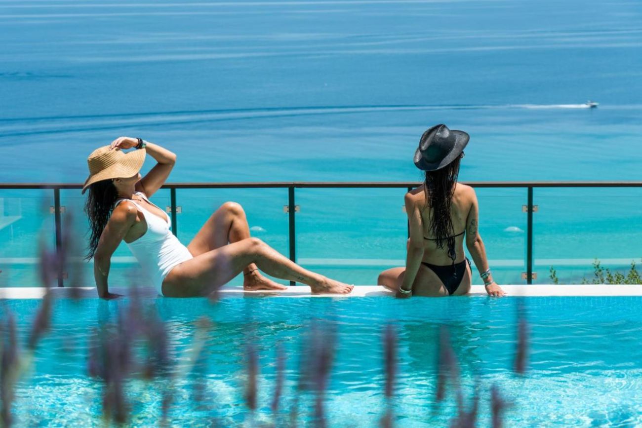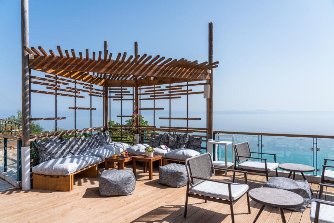 Плувният басейн със свободна форма и удобни шезлонги се намира на ръба на скалата и предлага изумителни гледки към кристално-синьото Егейско море в подножието.