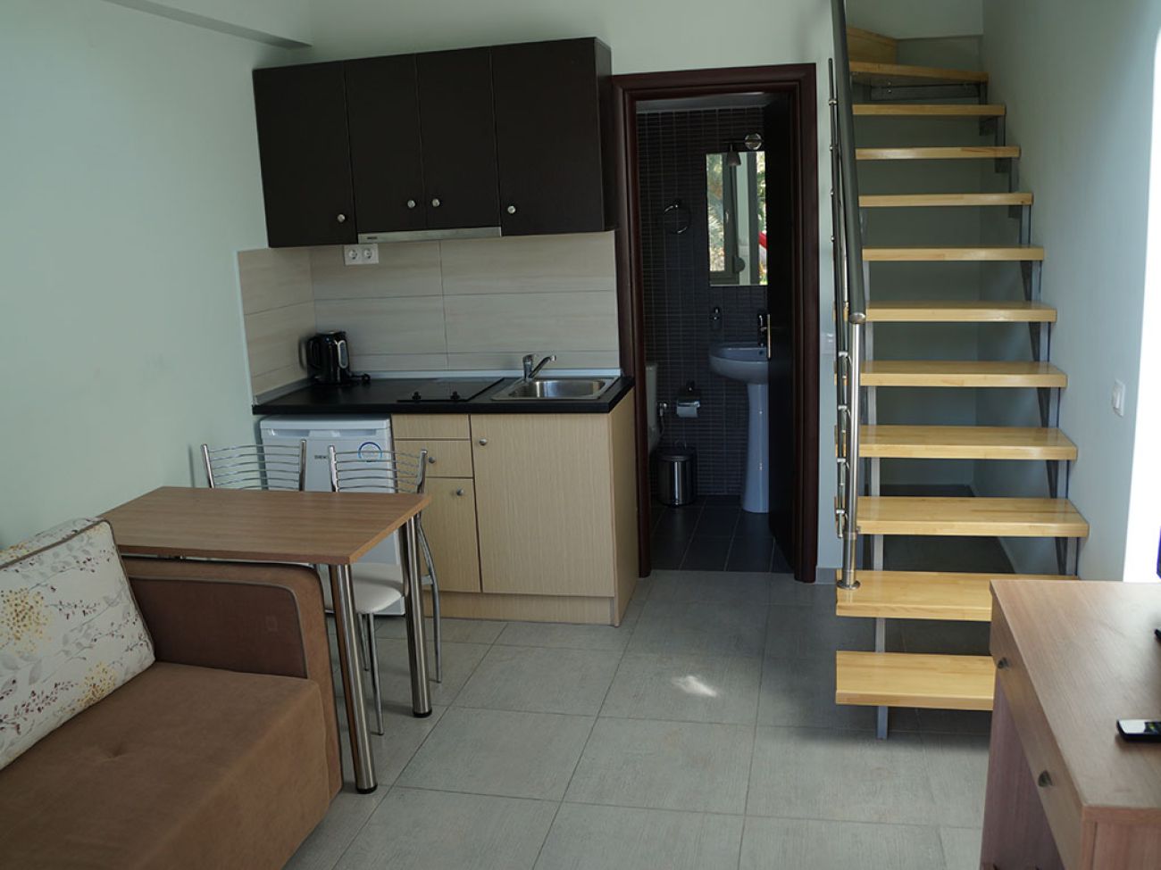 Apartment - на долния етаж: трапезария с мини-кухня, разтегателен диван, баня.На горния етаж: двойно (или 2 единични легла).