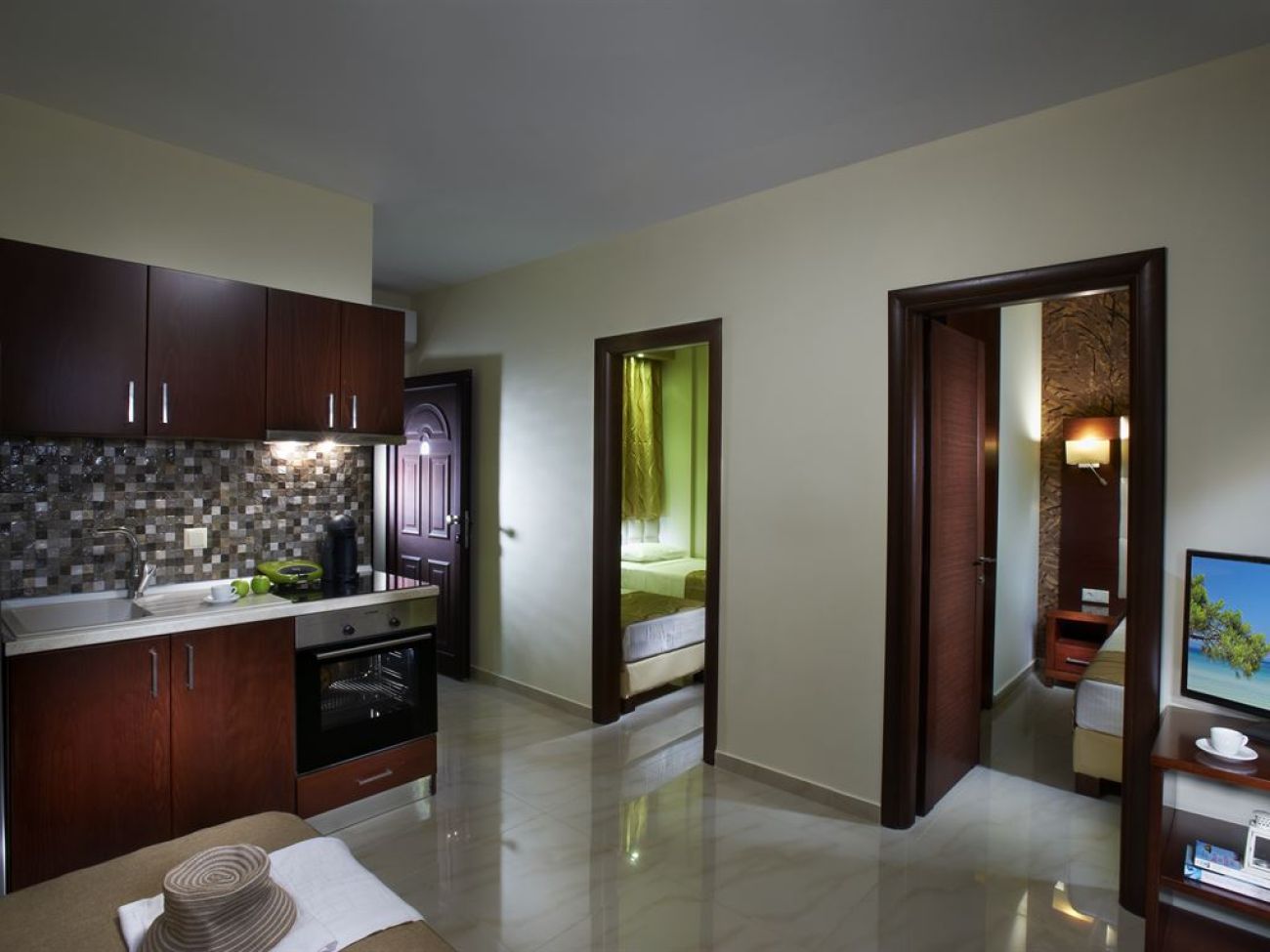 В стаите са на разположение: кухня (ел. печка с 2 котлона, фурна, тостер, кафе-машина, посуда), климатик, сателитна телевизия (private sat. TV, около 1000 канала), телевизор с плосък екран, анатомични матраци CocoMat, сейф (безплатно), хладилник, баня с душ, сешоар, кантар, Wi-Fi интернет (безплатно), веранда. Двойно и 2 единични легла. Расположени са на приземния етаж (Ground Floor). Всекидневна с кухня, 2 отделни спални. Ежедневно почистване на стаите.Смяна на спално бельо – 2 пъти седмично.