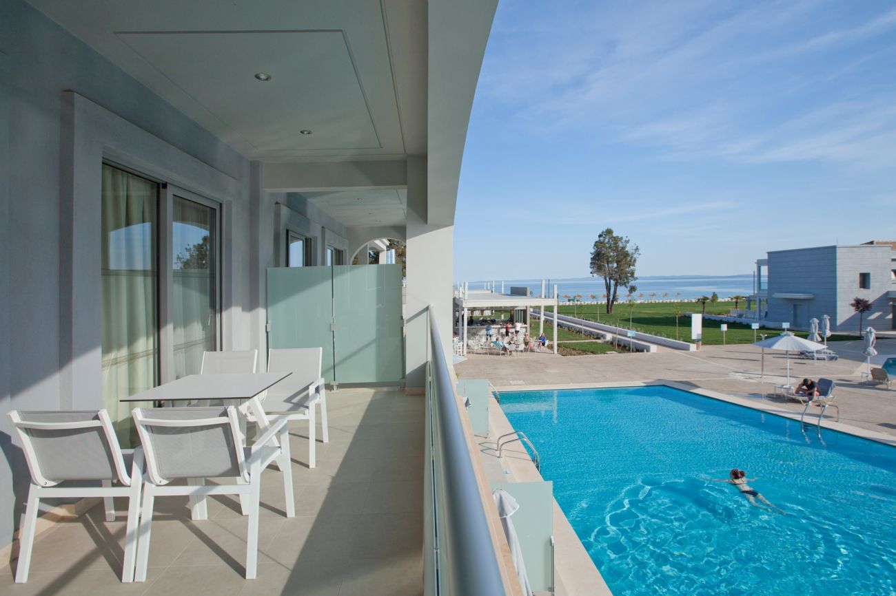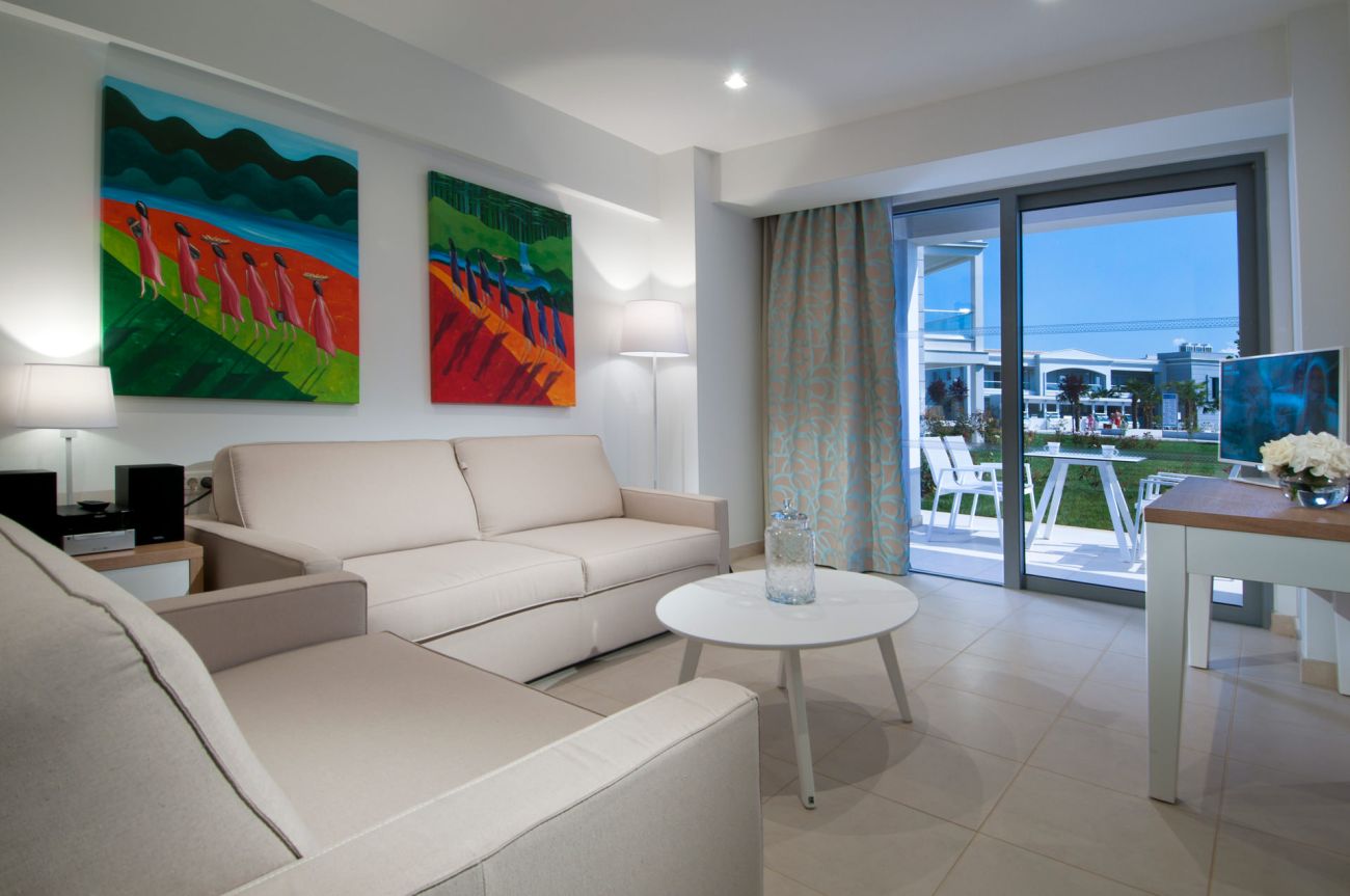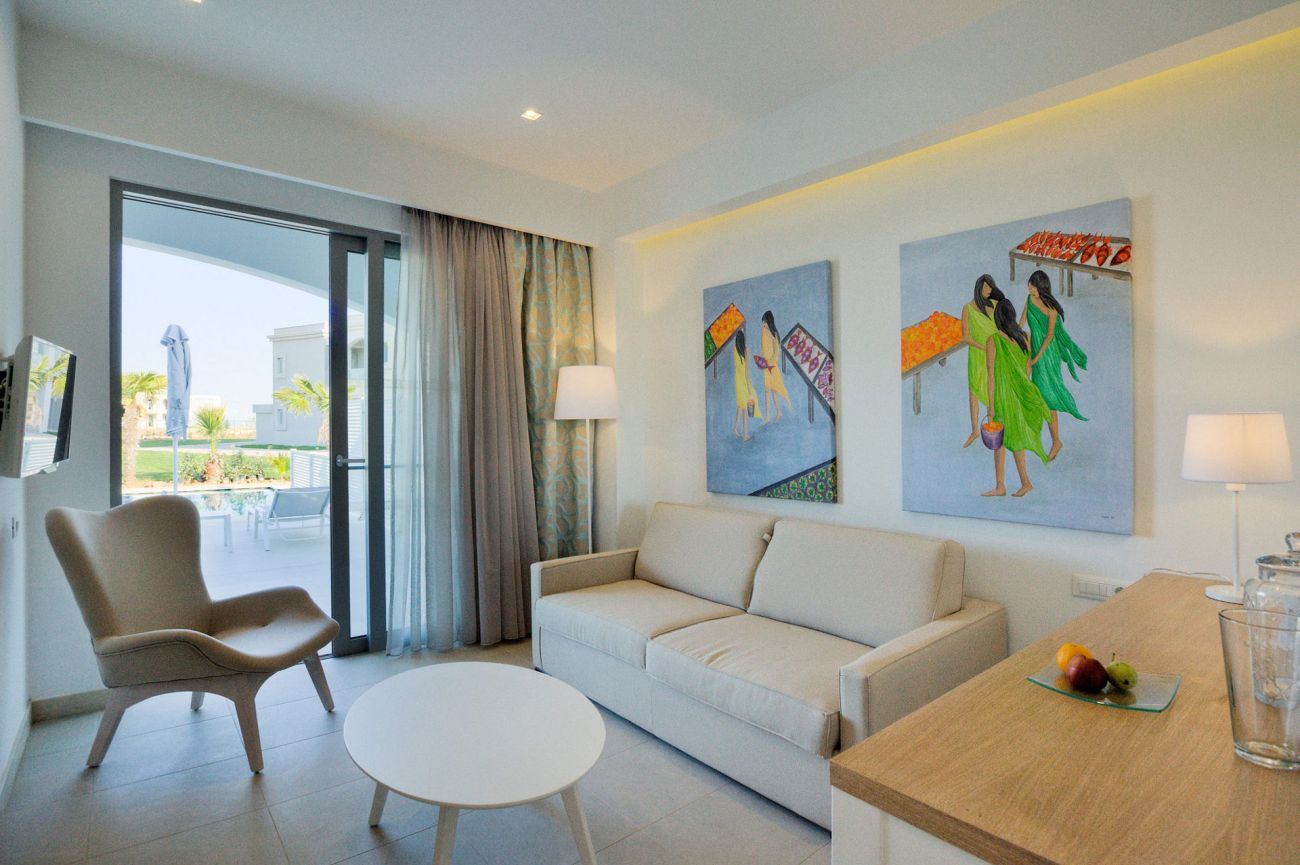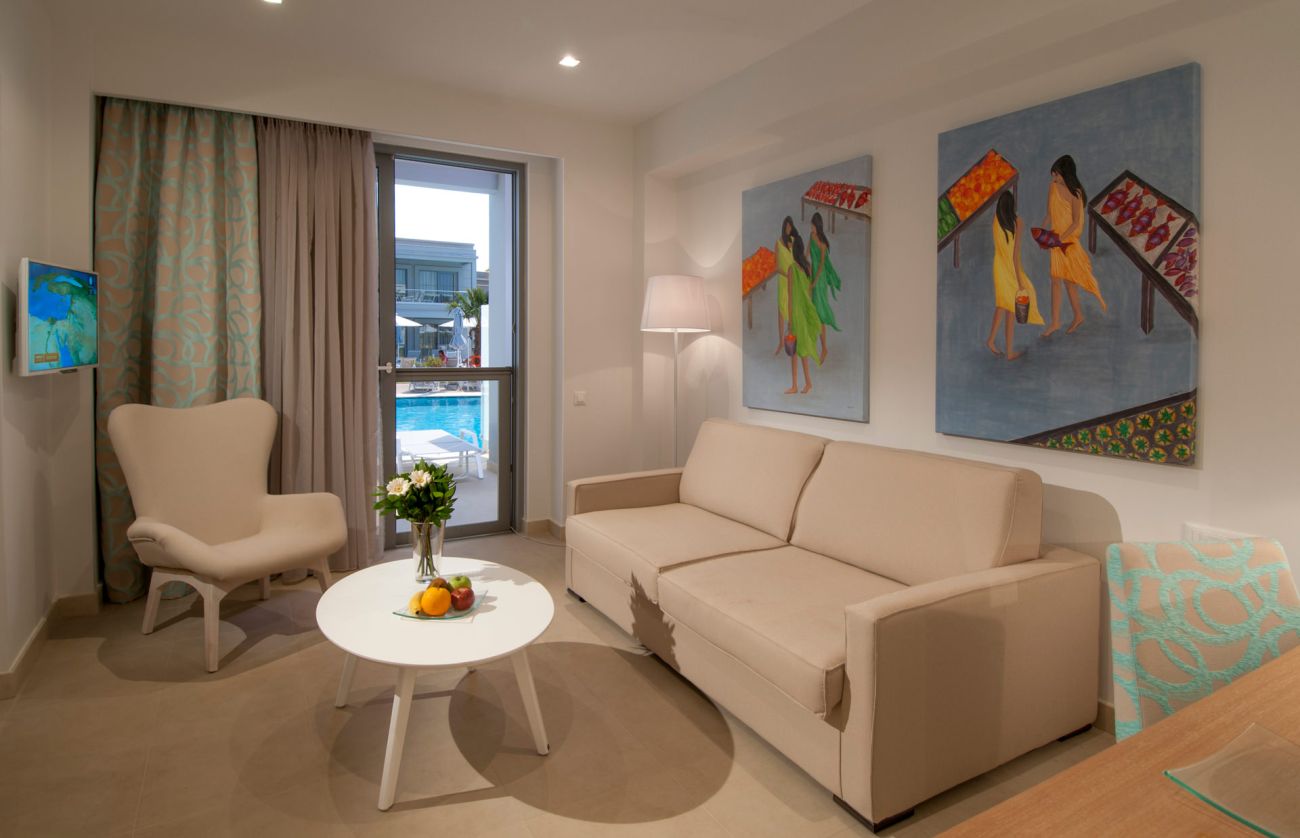 Junior Suite Sharing Pool Всекидневна, отделена с плъзгаща се врата от спалня с двойно или 2 единични легла, разтегателен диван. Пряк достъп до басейна.