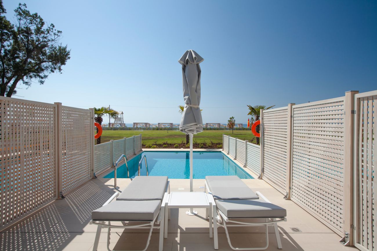 Junior Suite Private Pool Всекидневна, отделена с плъзгаща се врата от спалня с двойно или 2 единични легла, разтегателен диван. Тераса и частен басейн.