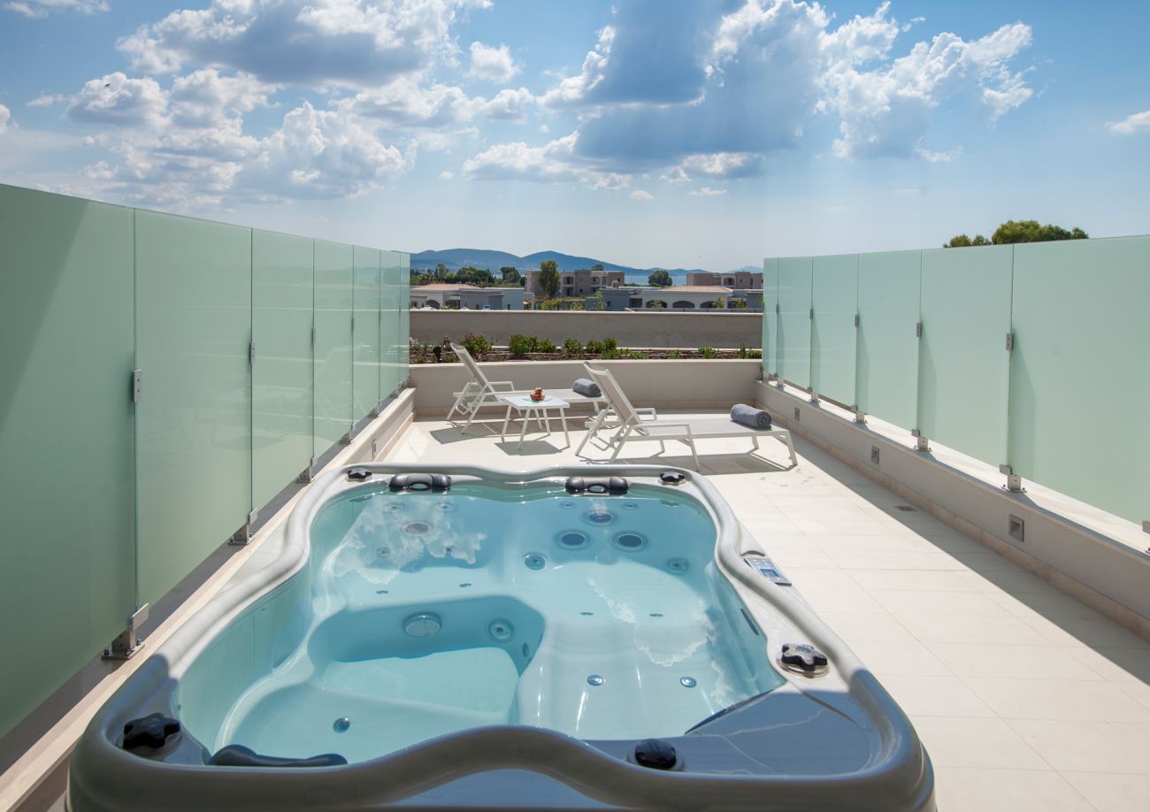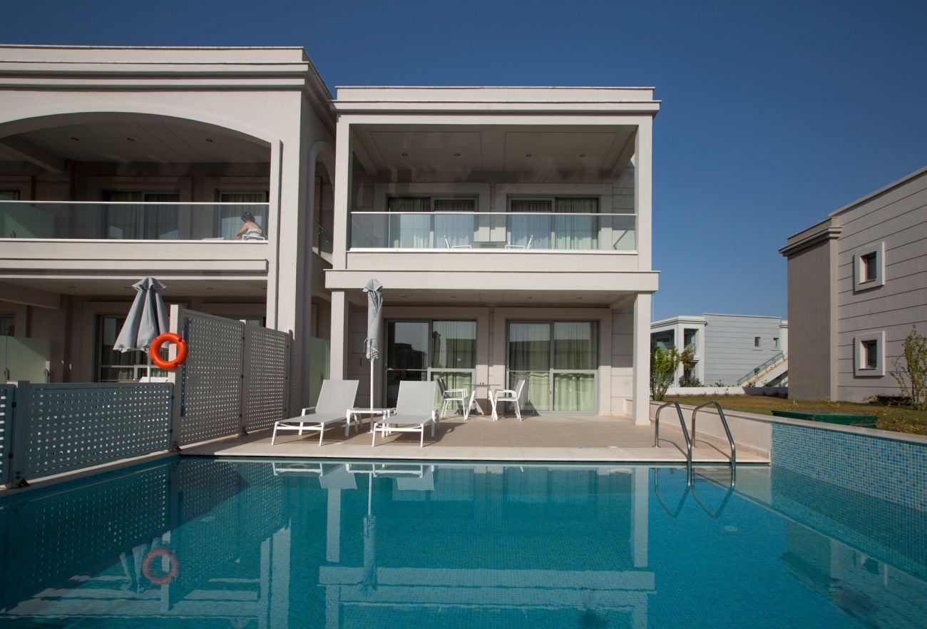 Deluxe Suite Private Pool Двуетажни суити. Изглед към морето. На долния етаж са разположени всекидневна, WC, тераса с частен басейн; на горния етаж - спалня с двойно или 2 единични легла, баня. Разтегателен диван и разтегателно кресло. 2 телевизора, кафе машина за еспресо.