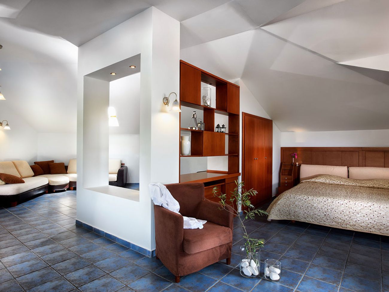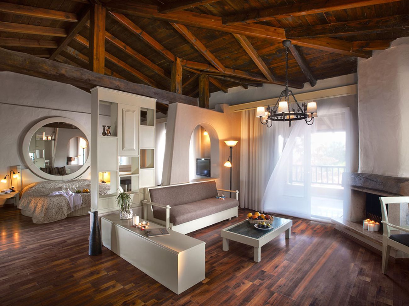 Екзекютив суити (~ 60 кв. м.)Една стая, съчетаваща спалня и всекидневна, вана с хидромасаж, бар, камина, тераса с изглед към морето.