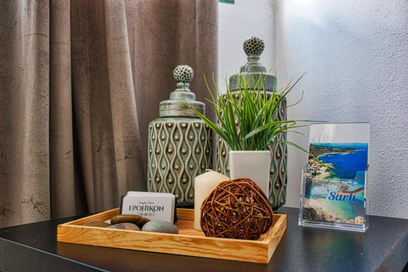 Epohikon Studios се намира в село Сарти, само на 100 метра от плажа. На 40 метра има ресторанти, магазини и супермаркети. Международно летище Солун е на 130 км. Собствениците на Epohikon Studios организират летищен трансфер срещу допълнително заплащане.