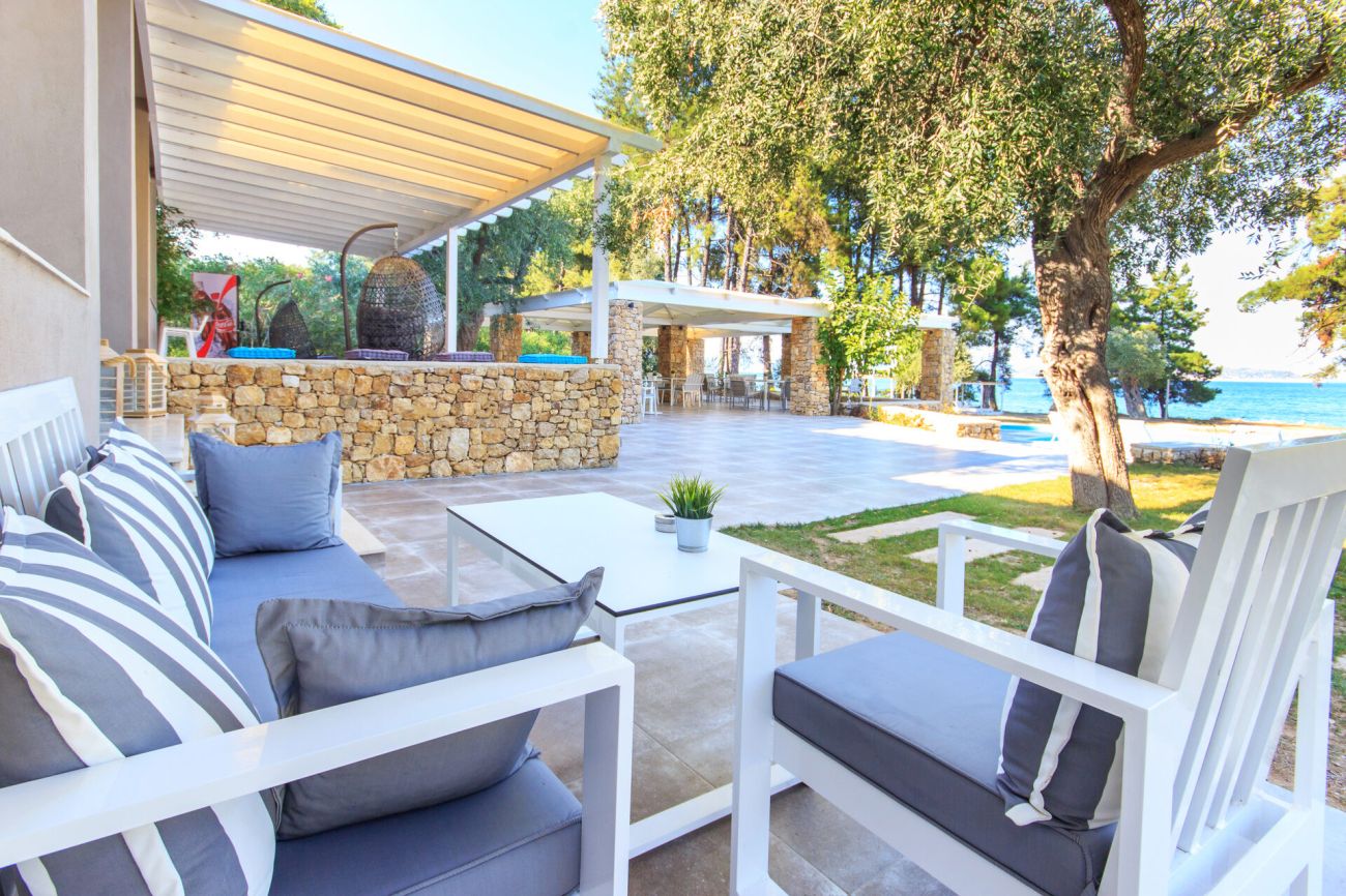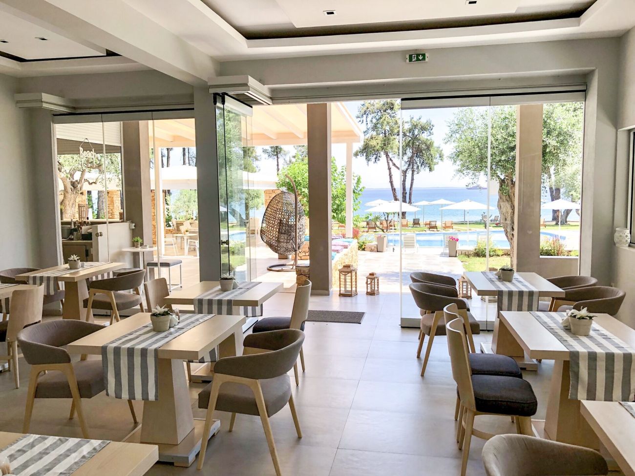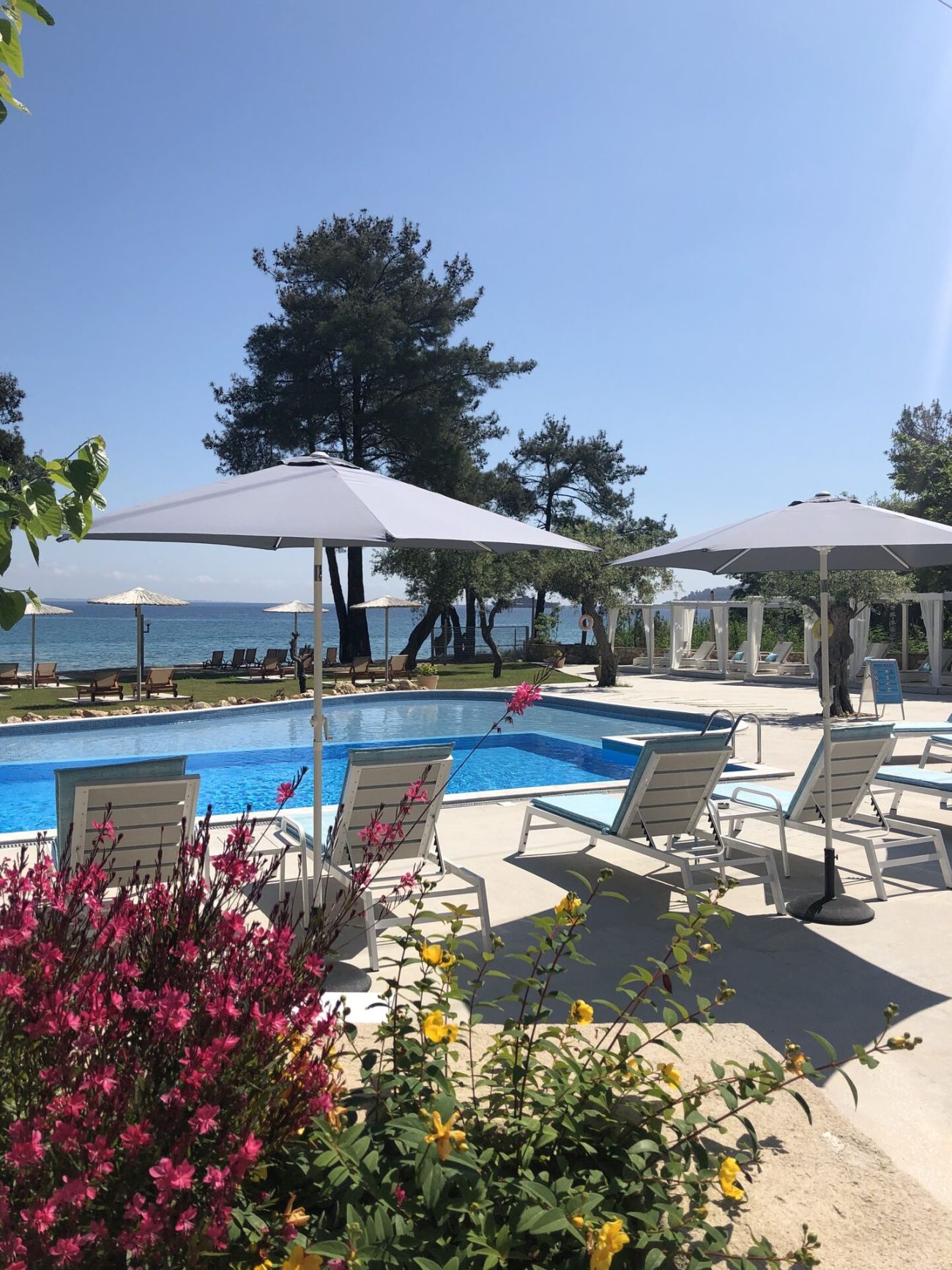 Малък уютен хотел на брега на морето с пясъчен плаж, заобиколен от борова гора.