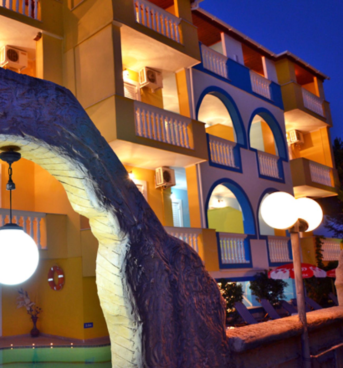 Малък уютен хотел, с поддържана зелена територия. Просторни стаи с оборудвана кухня, таверна, бар, плувен басейн, детска площадка, интернет, топла и уютна атмосфера. Близо до хотела са разположени магазини, ресторанти и барове. Идеален избор за семейна почивка на добра цена.